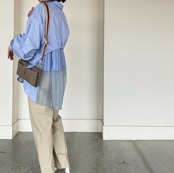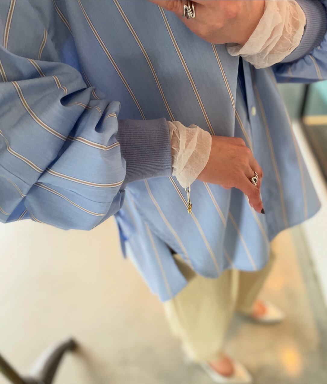 バックプリーツがシアーに⭐︎エアリーさがプラスされた大人気ブラウスが今季も登場♪ギャザーレイヤードプリーツ ストライプシャツです。