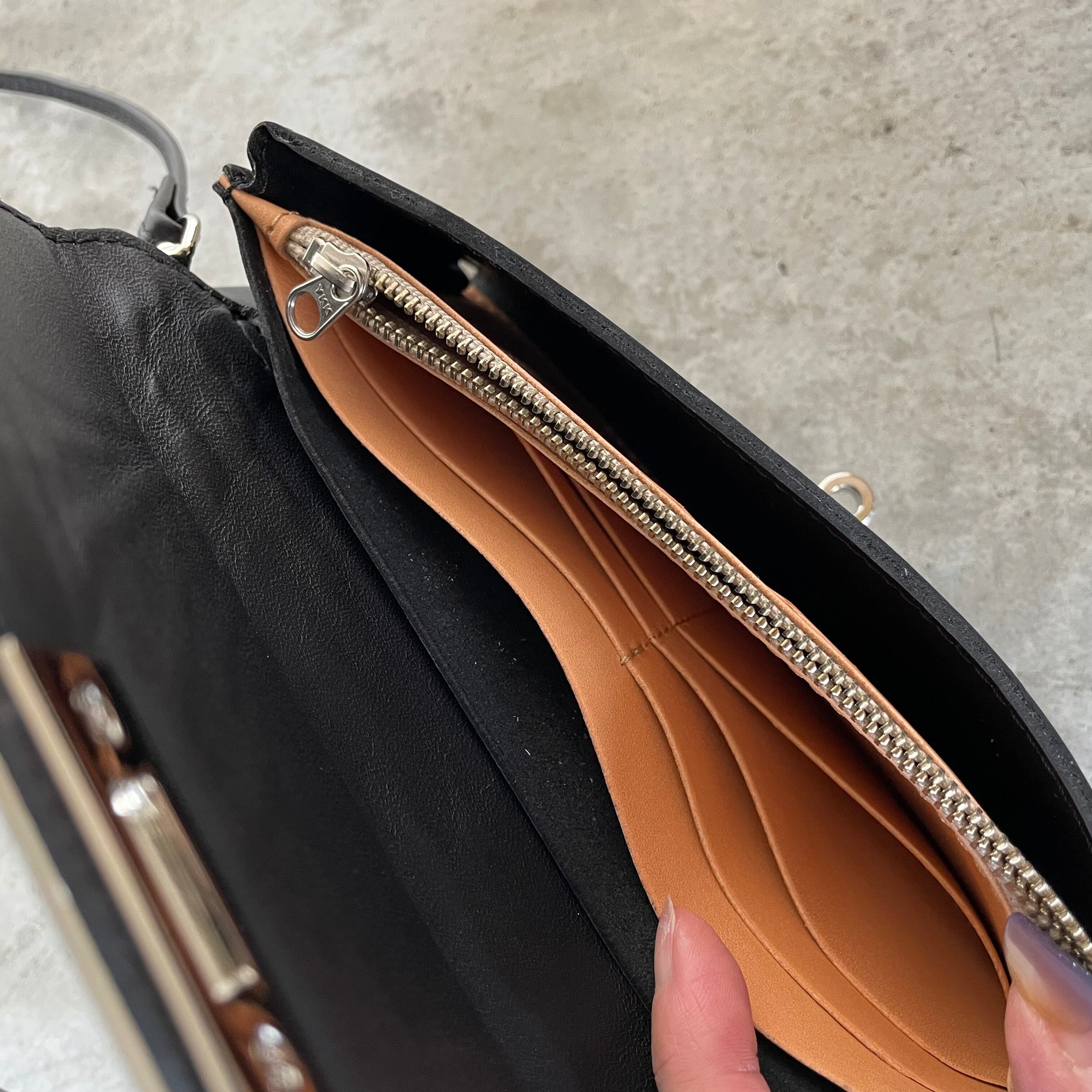 内側には仕切り・ファスナーポケット・カード入れがあるでのそのままお札や小銭を入れてお財布◎!
