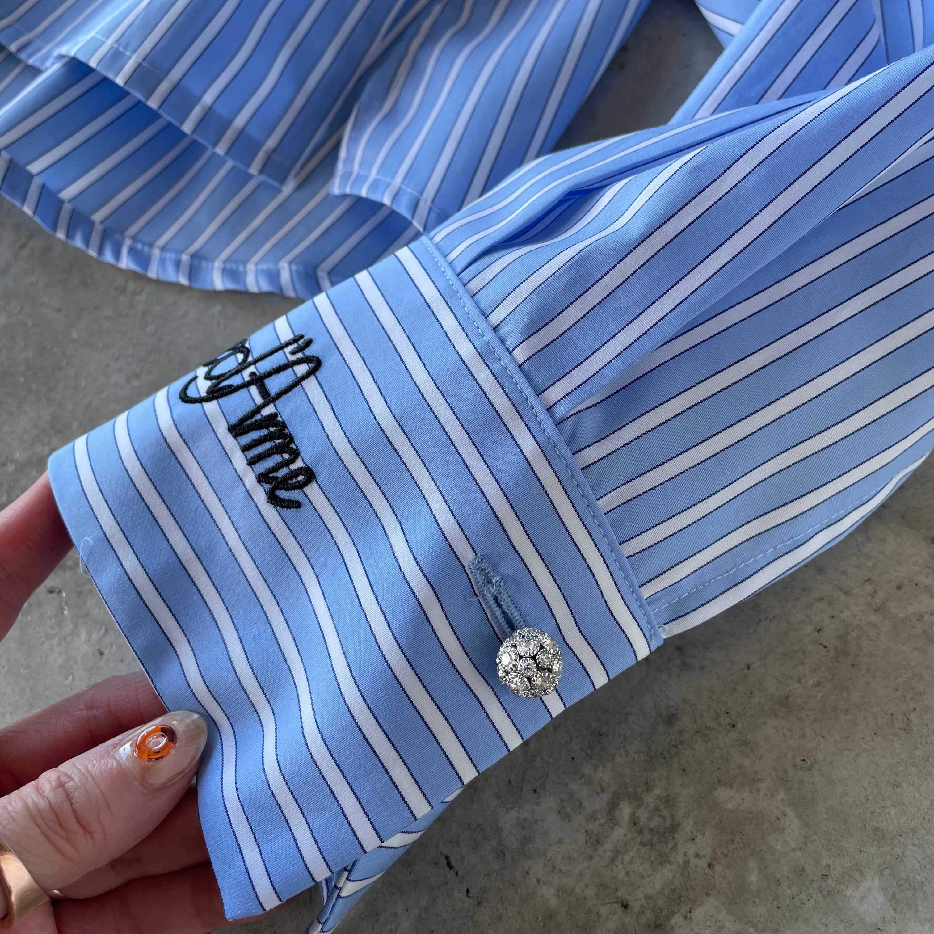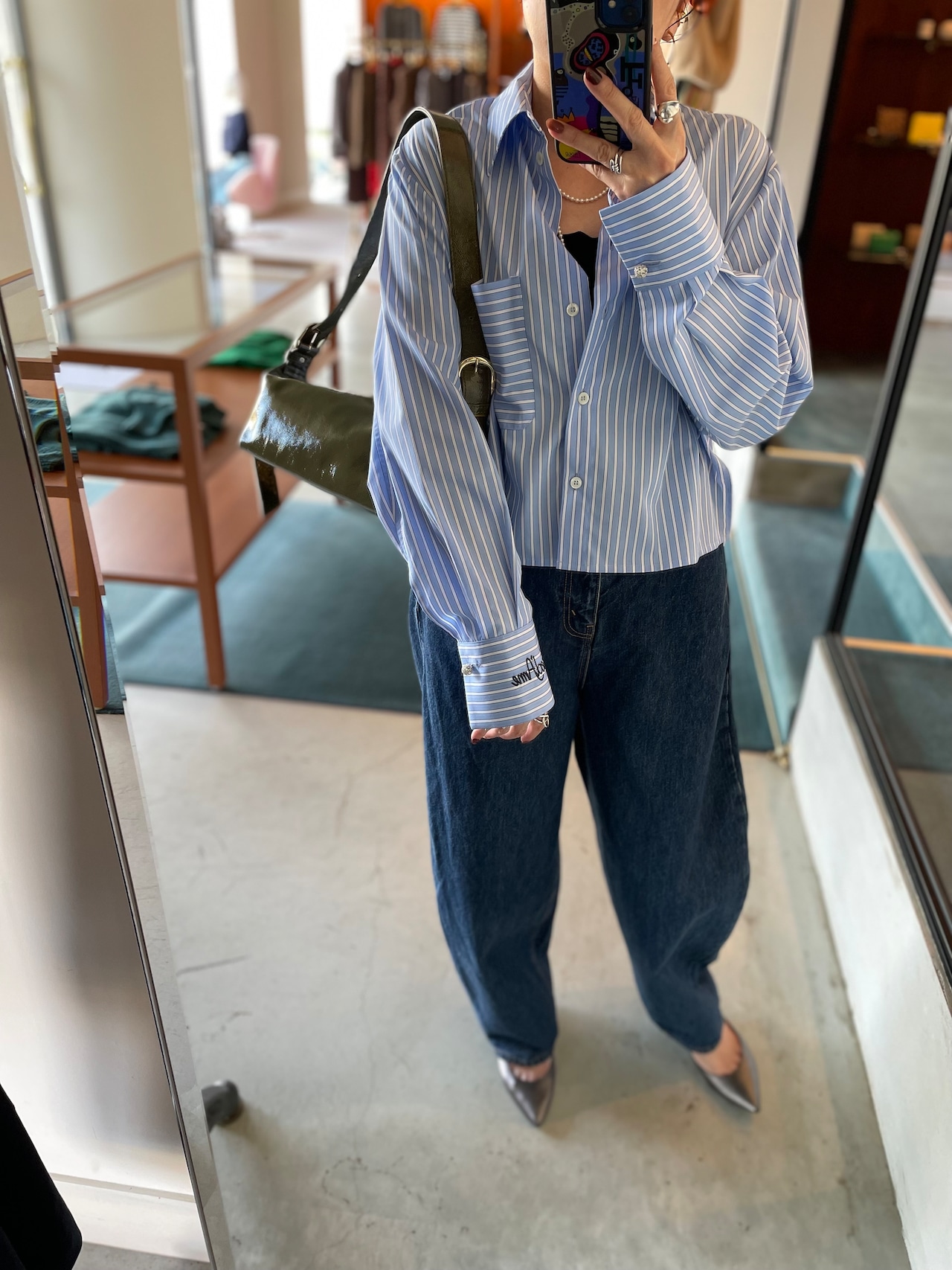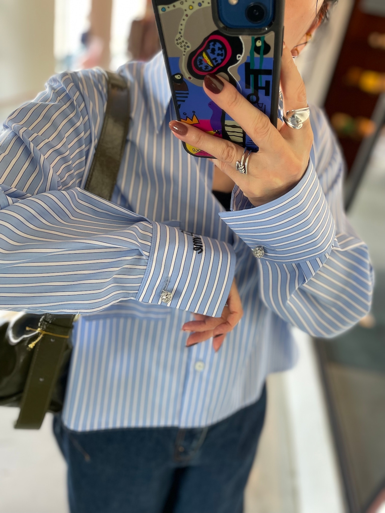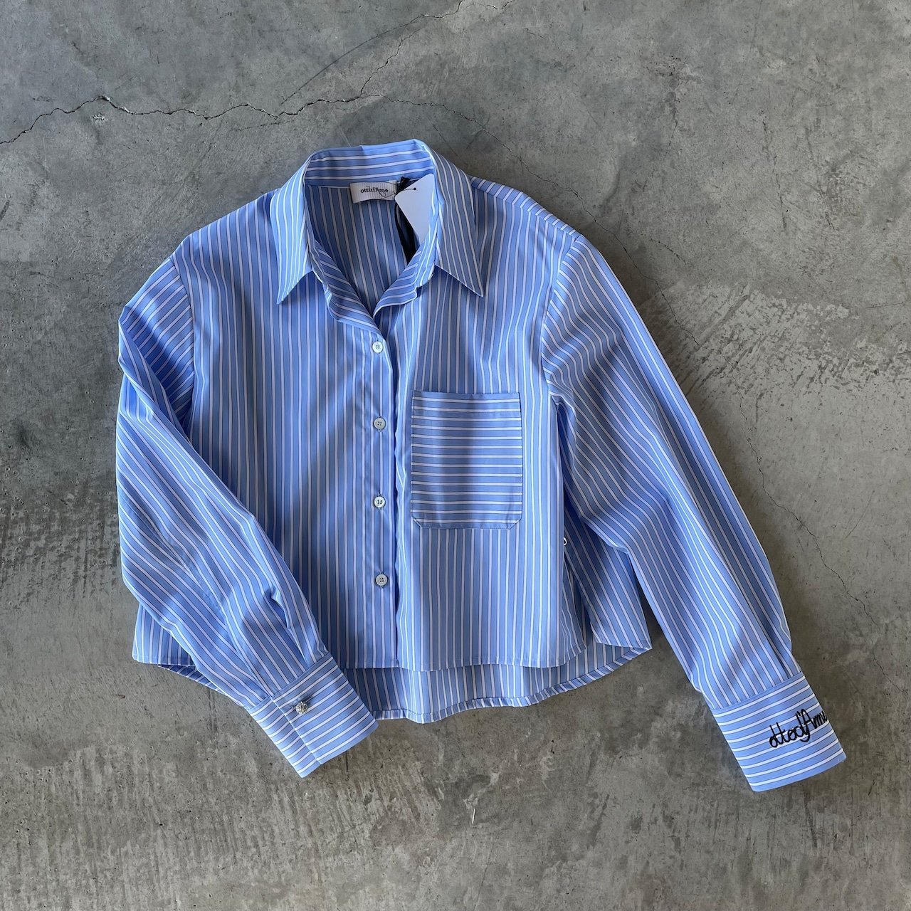 細部まで"こだわり"たっぷり♪ 袖刺繍ロゴス トライプショート丈シャツブラウス/ottod'Ame オットダム