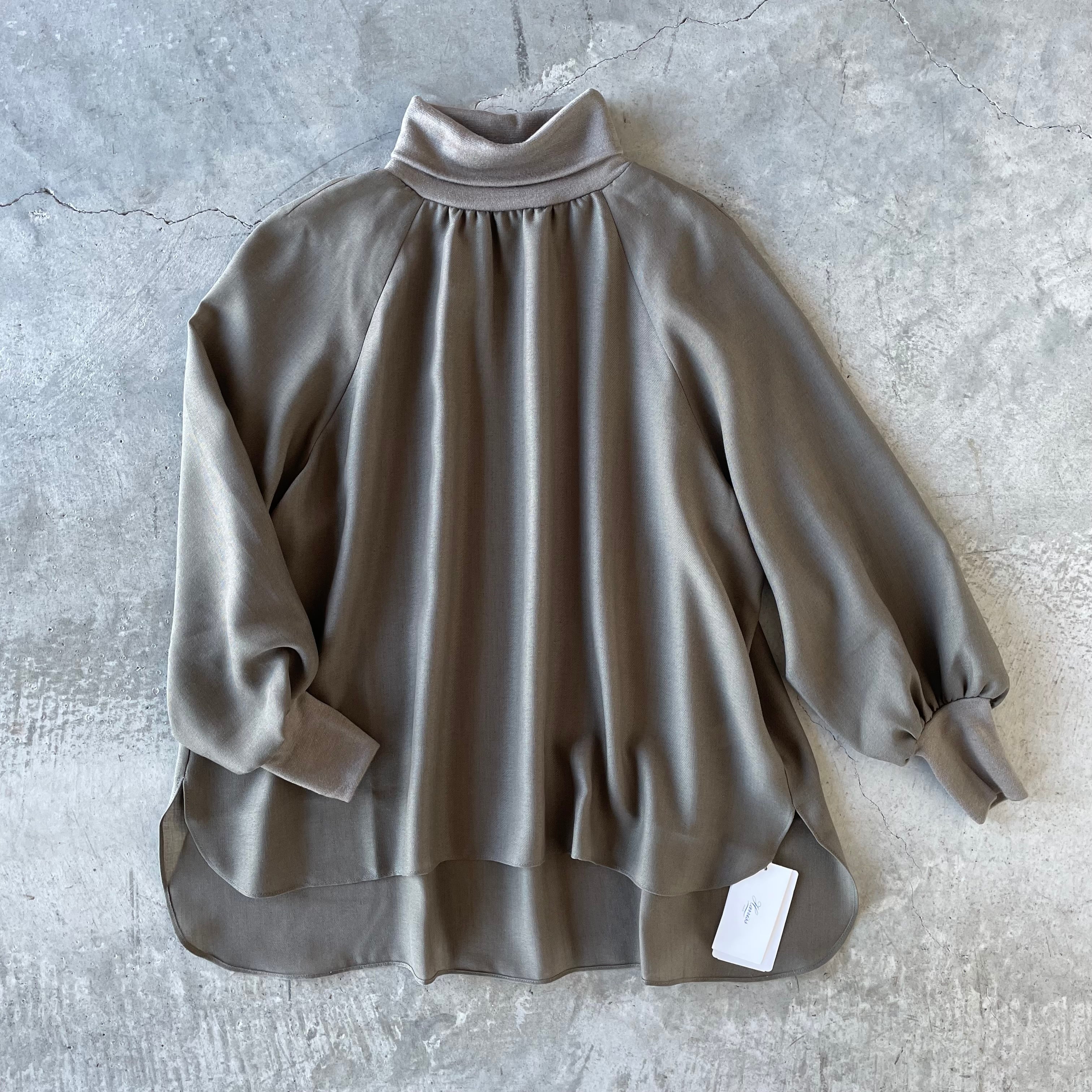 タートルネック部分と袖口カフス部分を伸縮性のあるジャージ素材を使用した、異素材トップス。