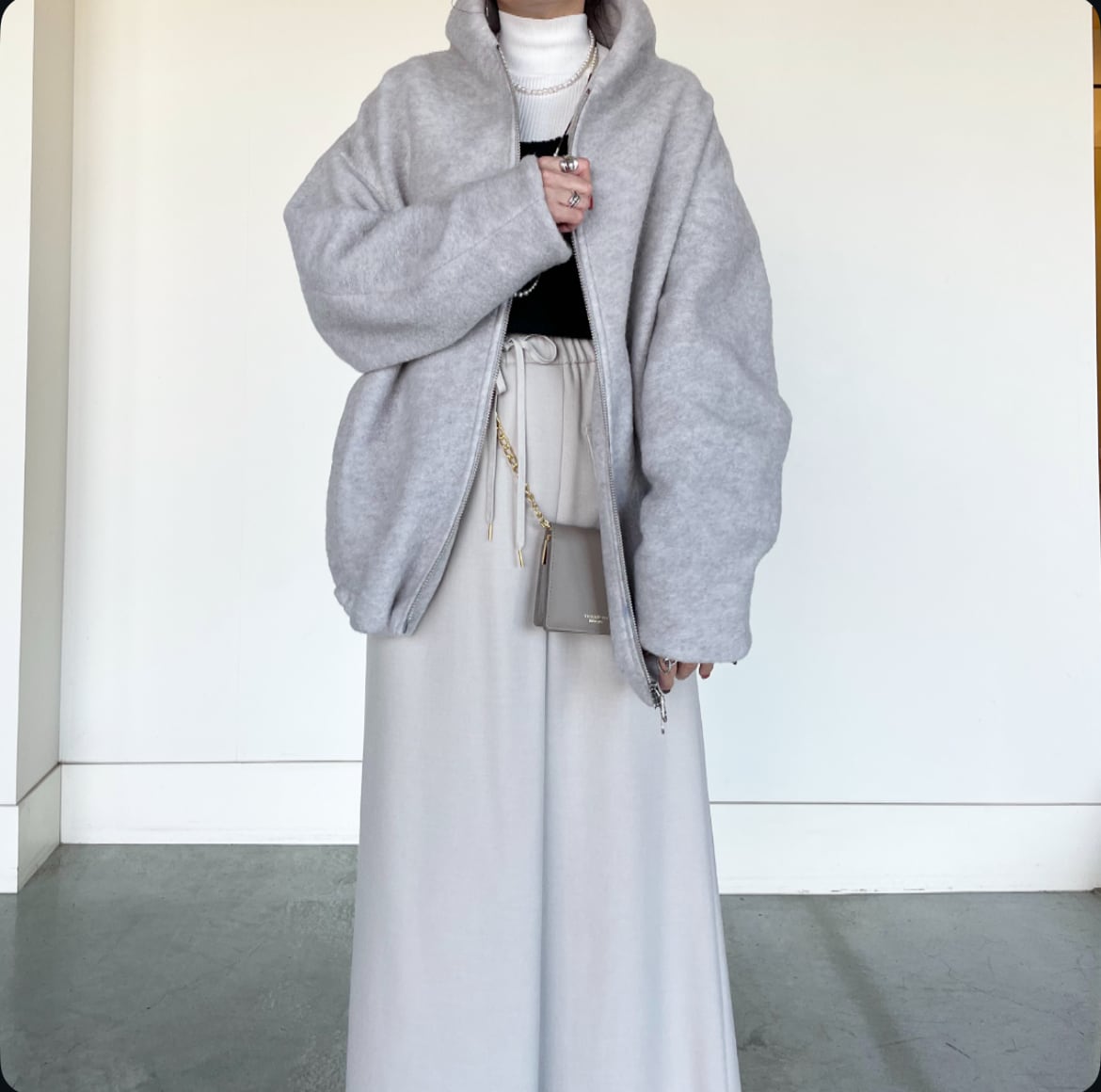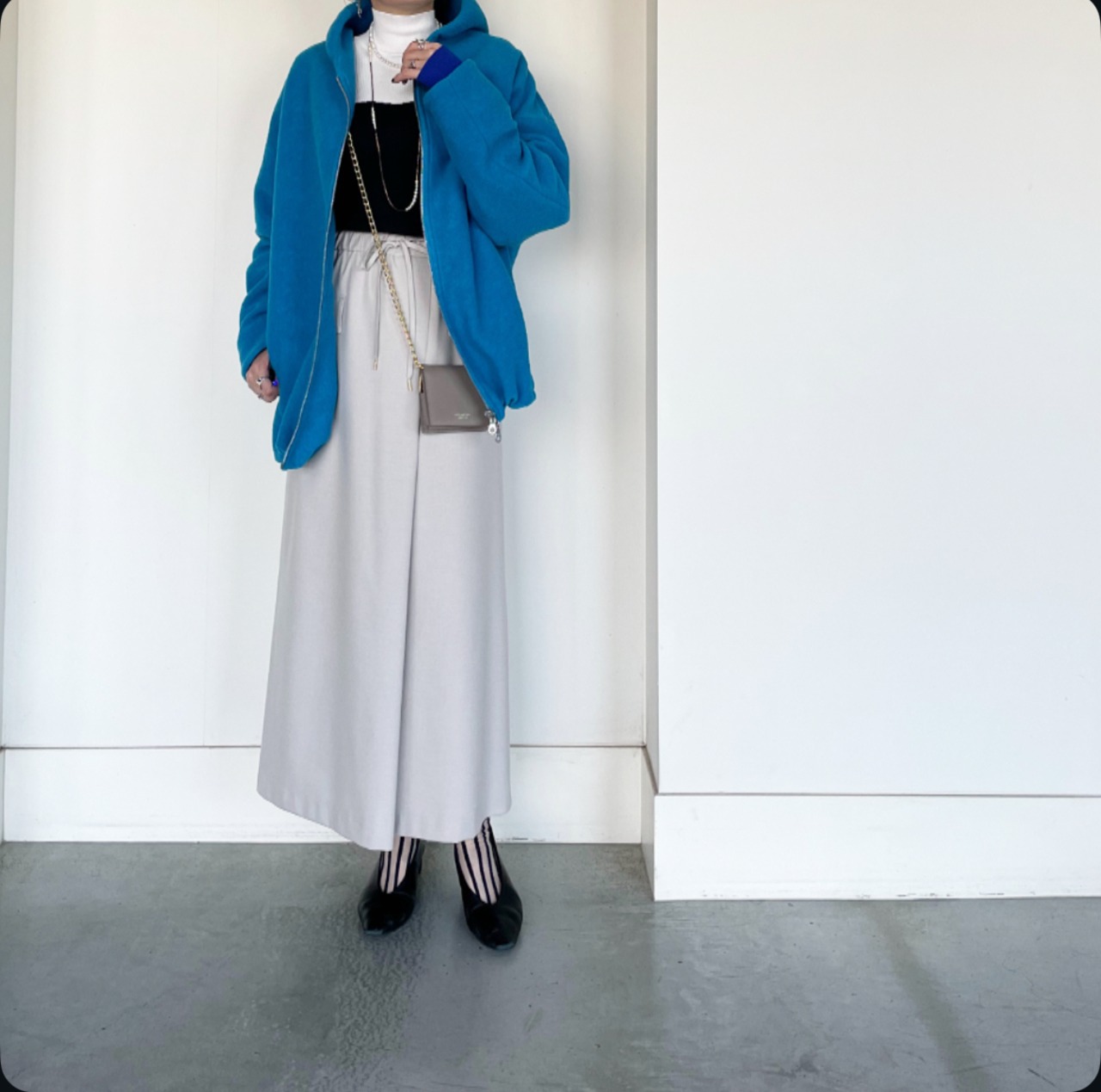 今旬コーデのニットベストで合わせたり、オーバーサイズのニットやカットソーなどを合わせても可愛い、オススメあったかスカートです。