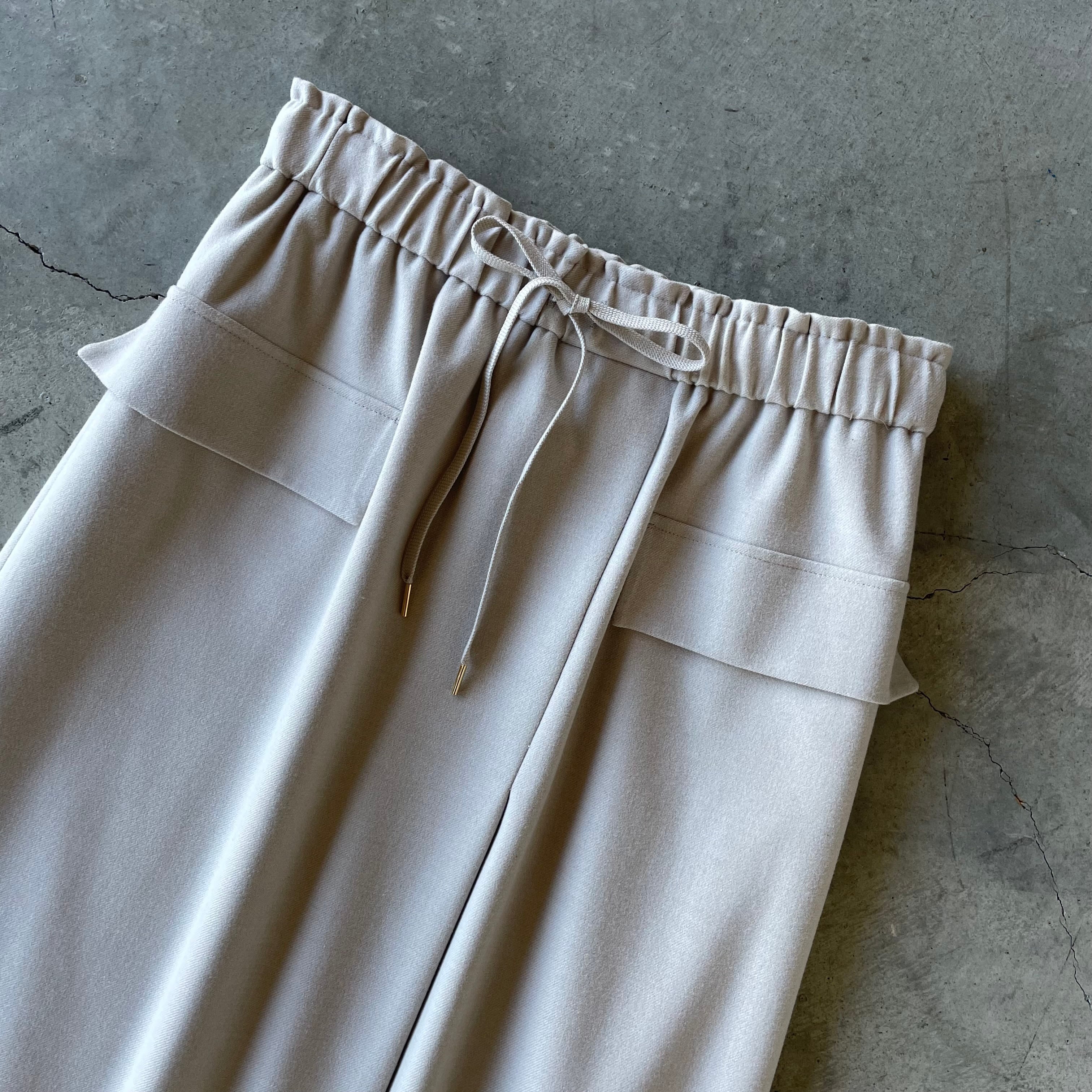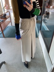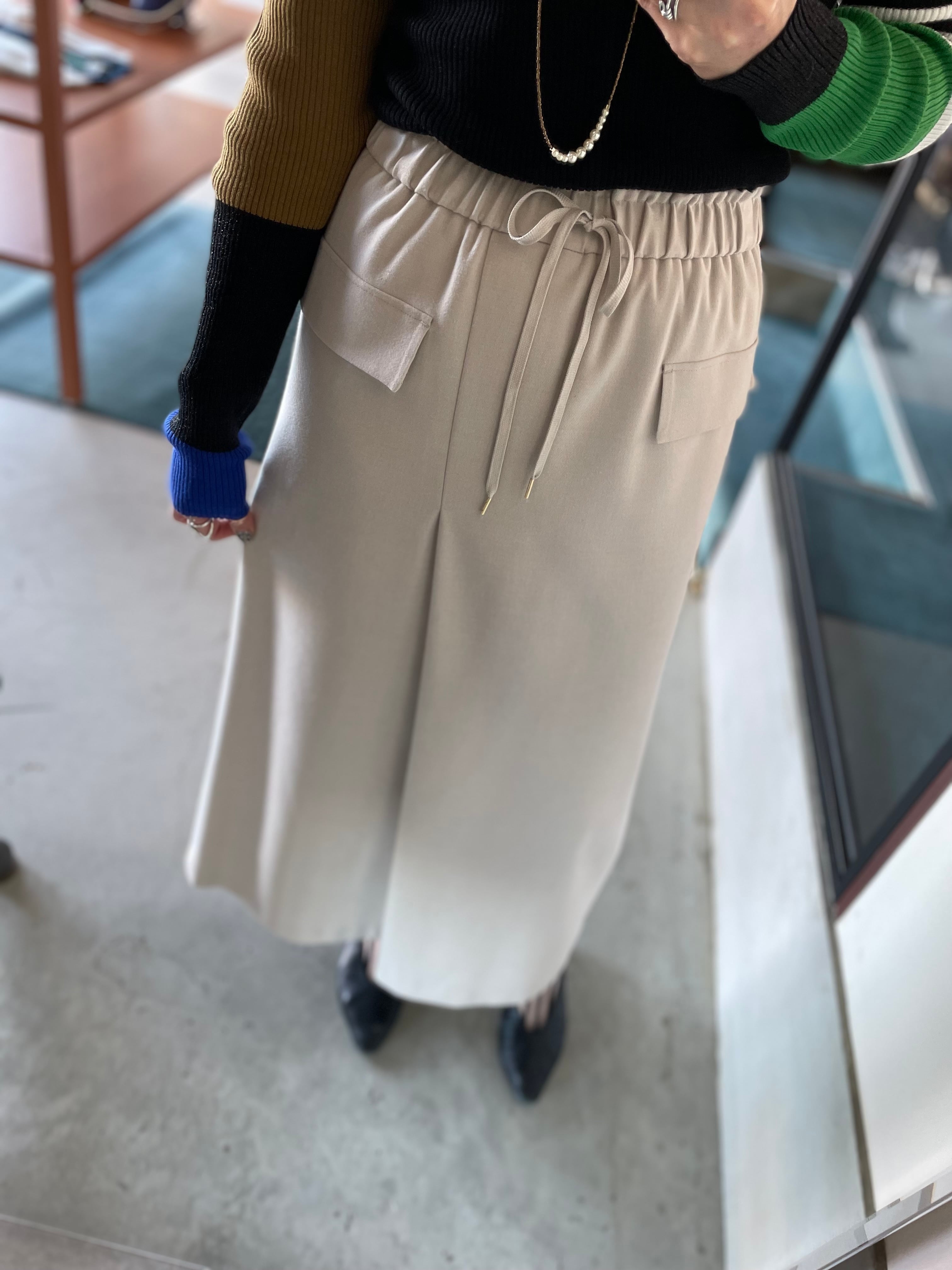 ダミーのフラップポケットがアクセントになったロングスカート。フロントに大きくタックを施した動きのあるデザインでほどよいゆとりを生み、足さばきは見た目以上に快適です。