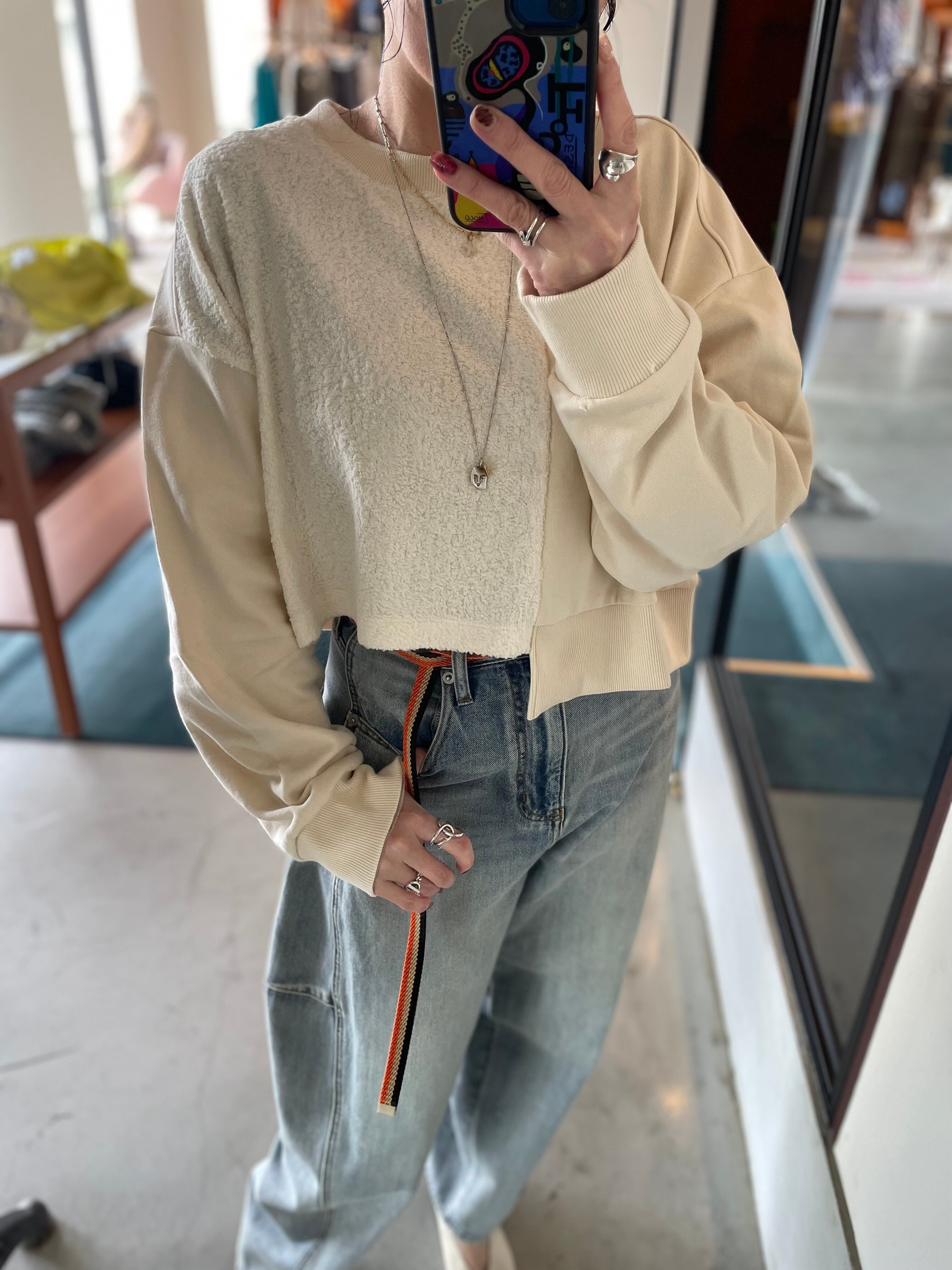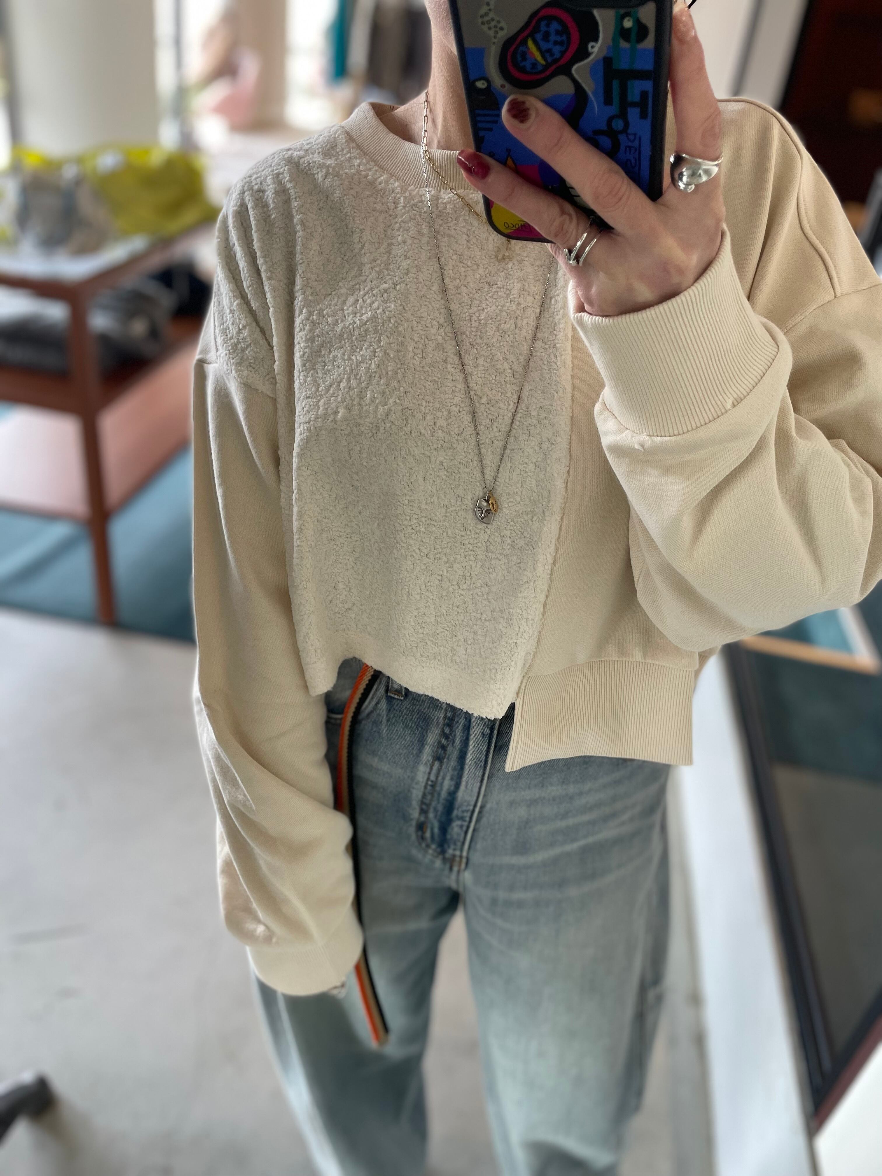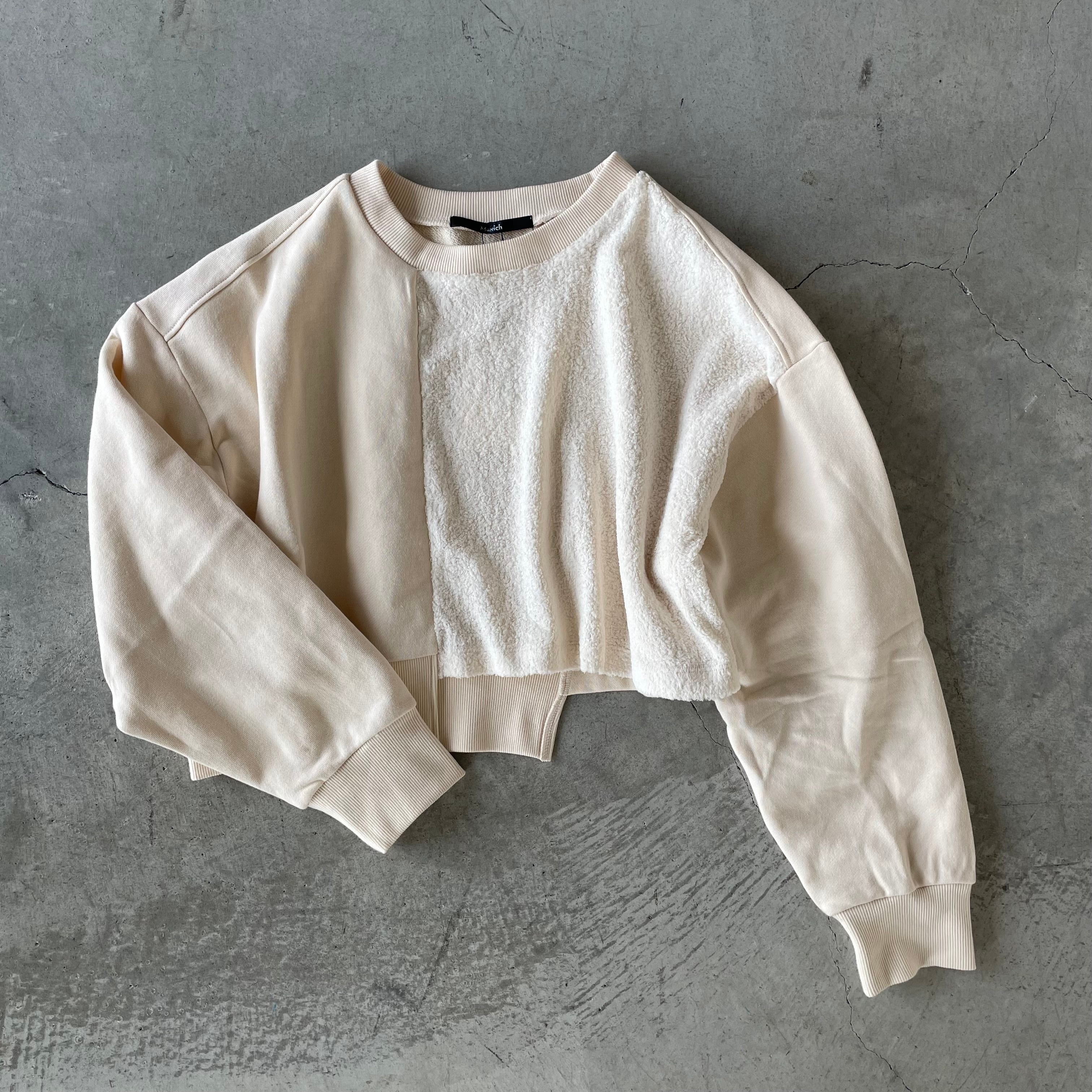 レイヤードも楽しめる⭐︎アシメなショート丈が可愛い♪ 裏毛×チンチラアシンメトリースウェットです。