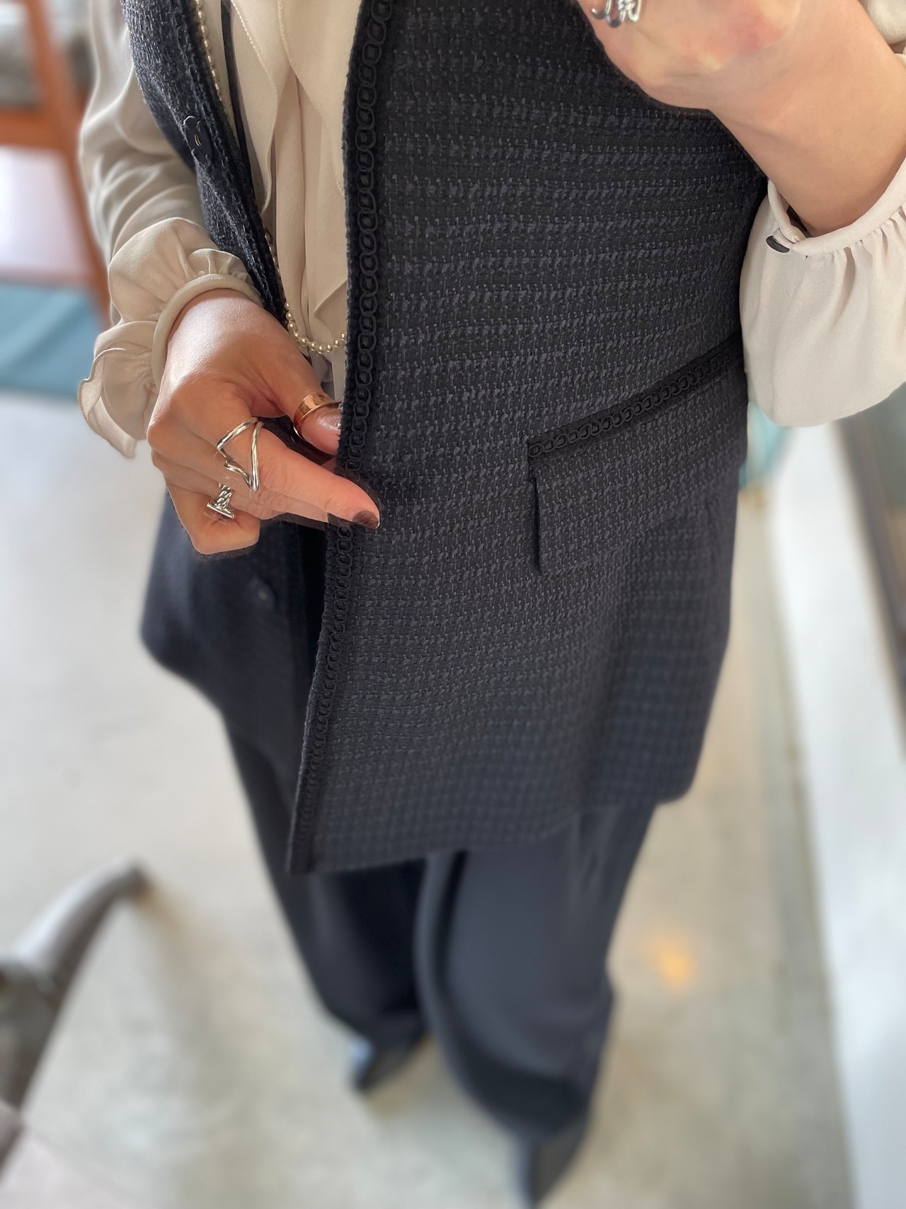インナーにトロッとしたブラウスを合わせればエレガントに!