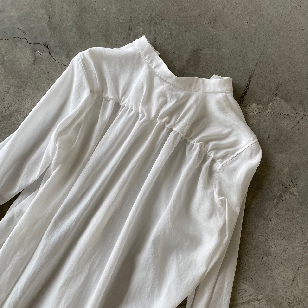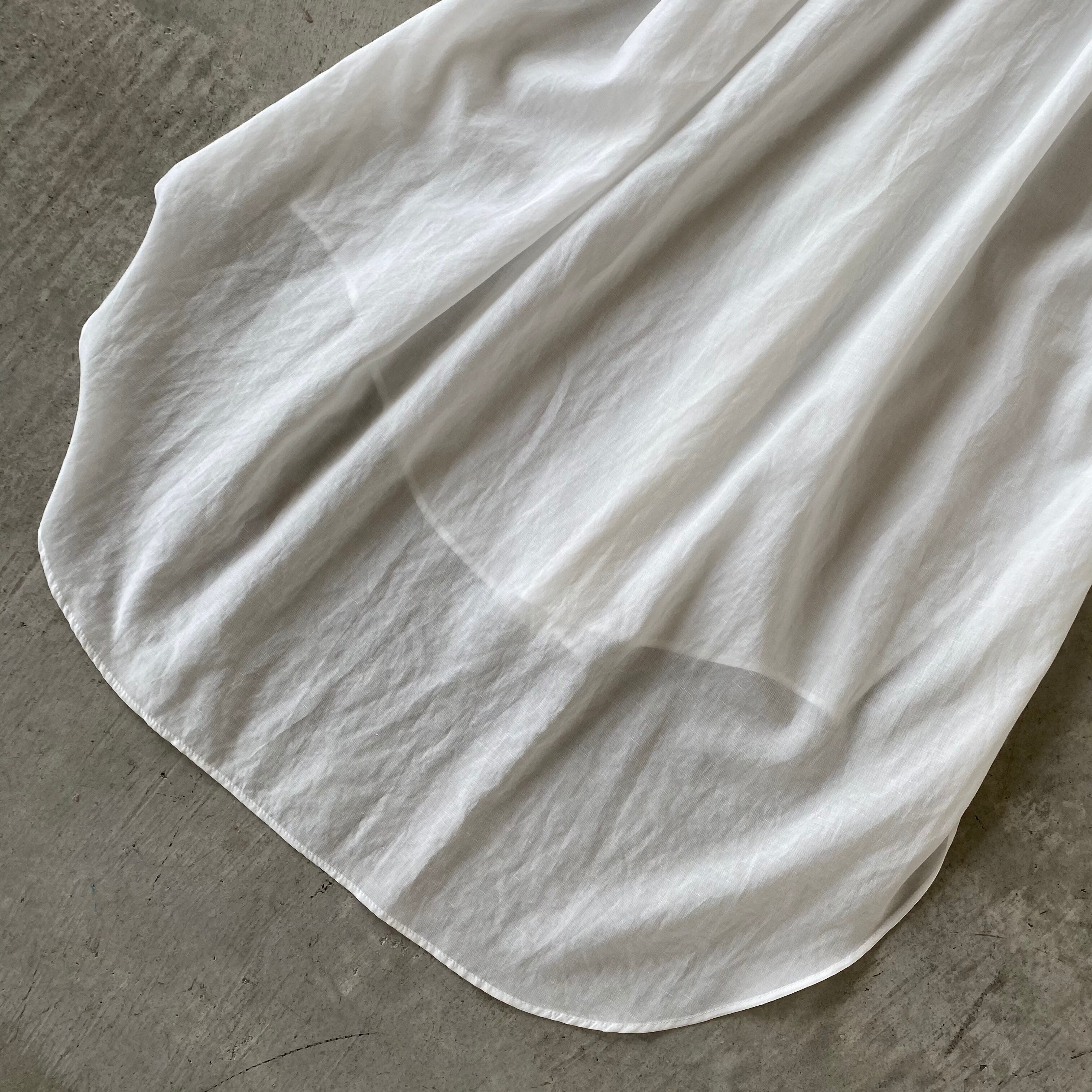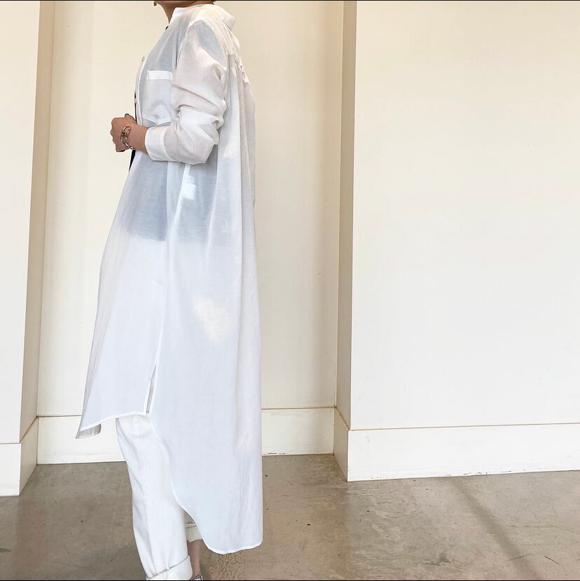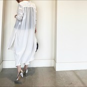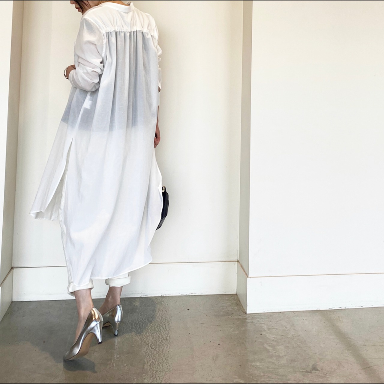 程よい透け感のある素材なのでロング丈でも重たく見えず、ボトムスをレイヤードすると今年らしい着こなしに◎。