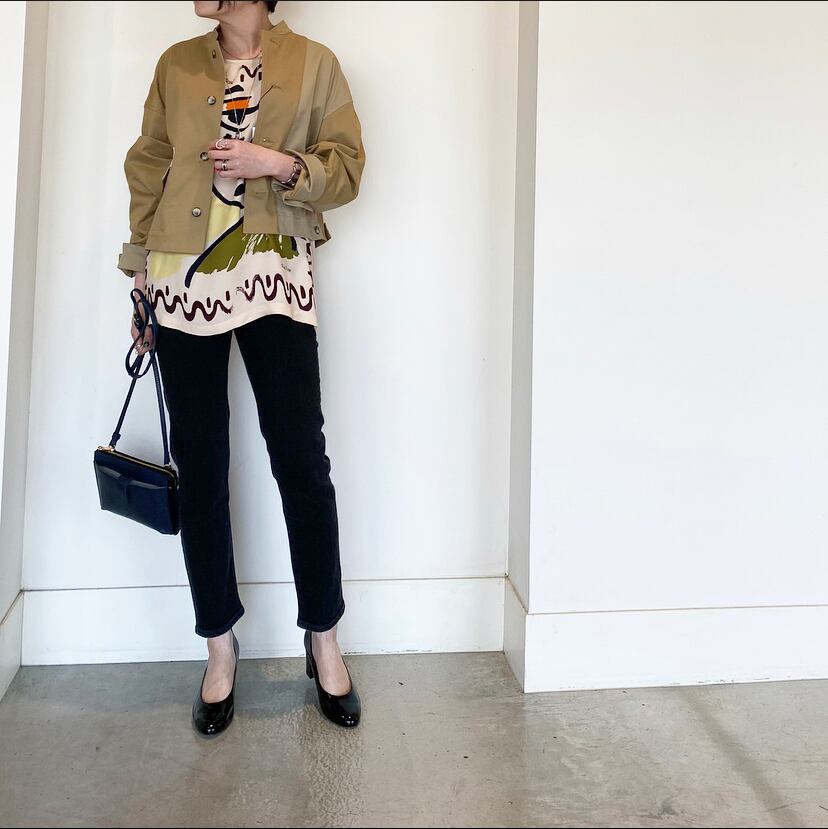 キレイめ感のあるさらっと落ちる素材感なので、アウターにはあえてカジュアルなチノジャケットをon!