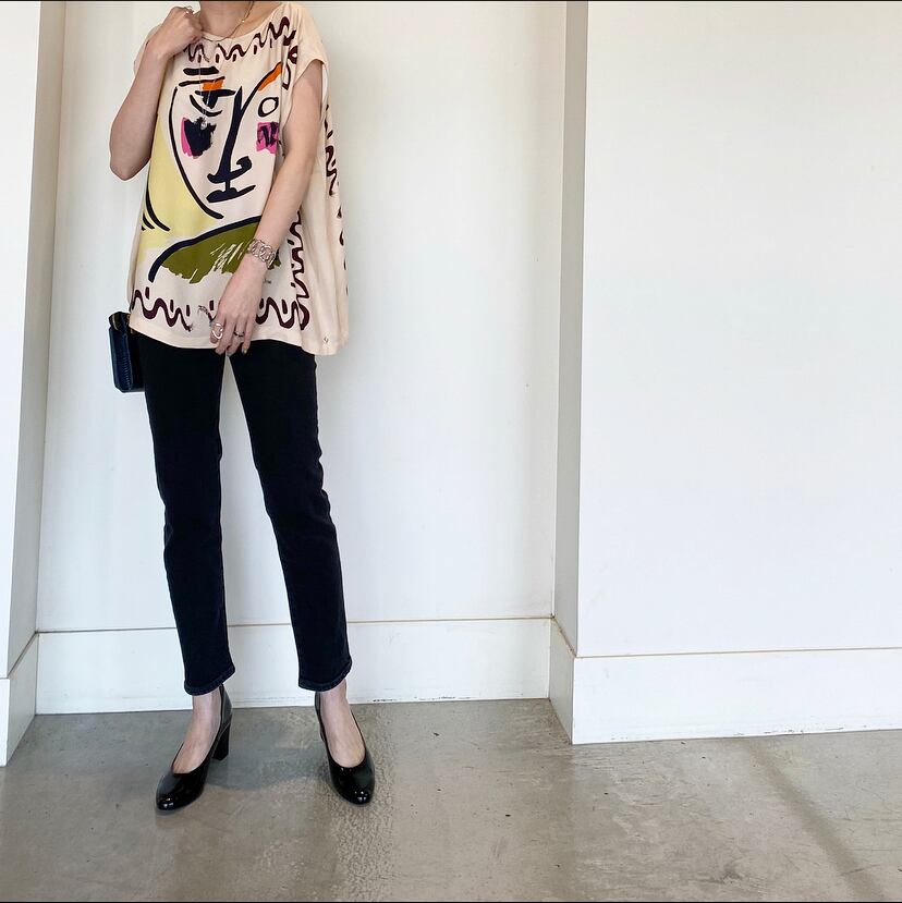 1枚で華のあるデザインですので、ボトムスはブラックデニムなどで合わせてシンプルに着こなすのがおすすめです。