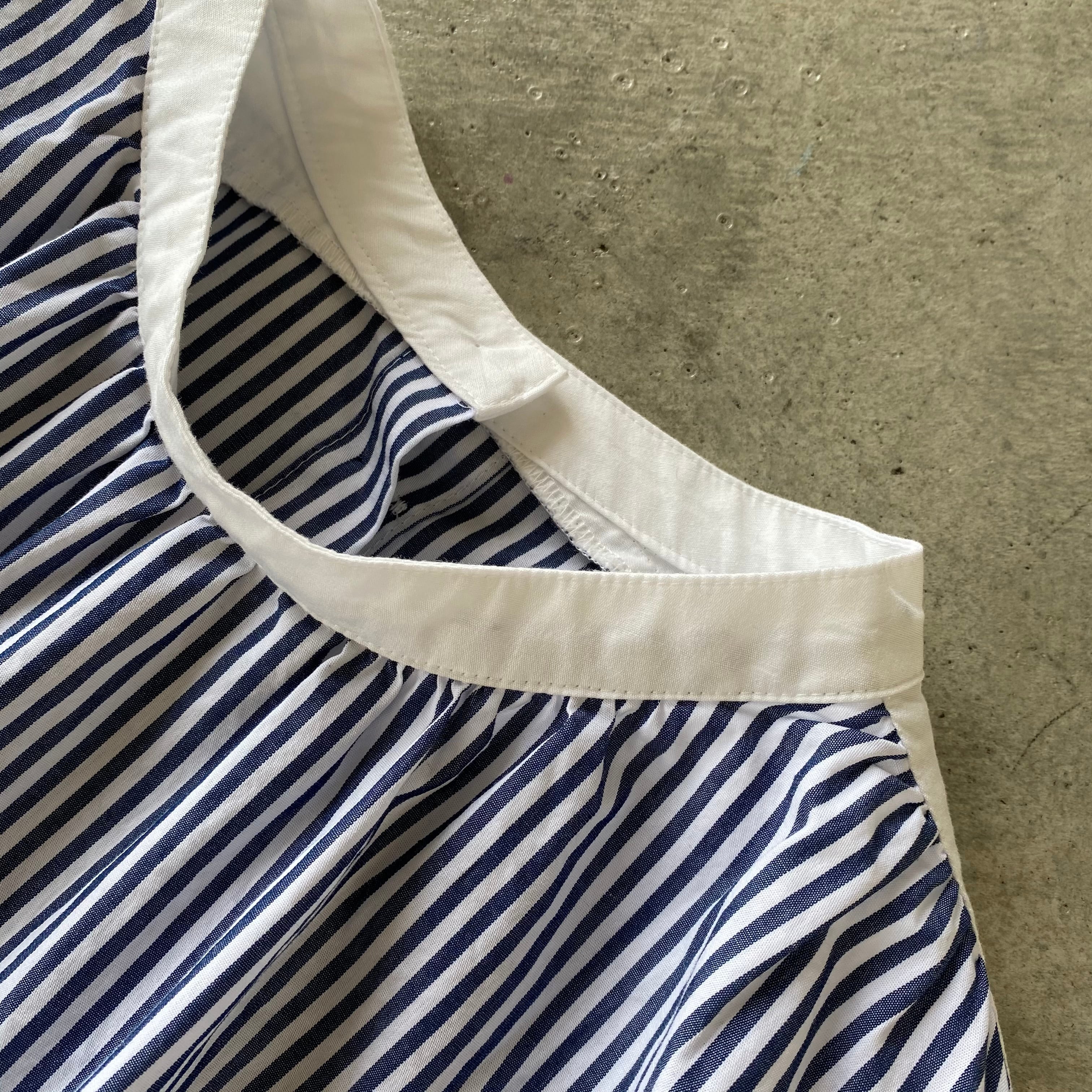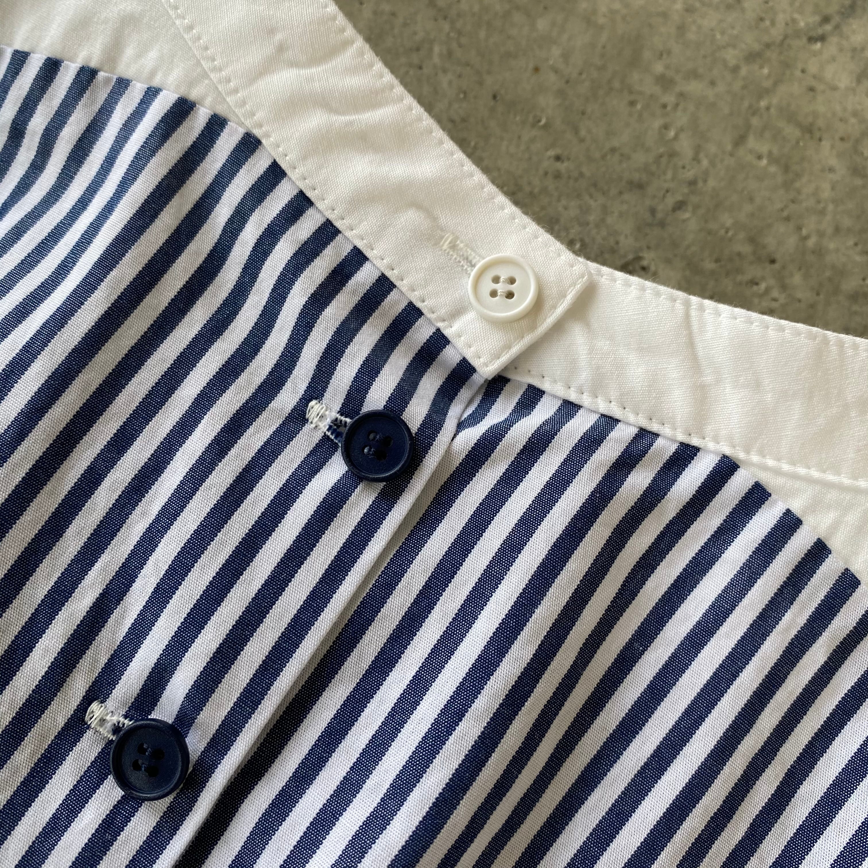 品の良い"きちんと感"が魅力のクレリック!ネックやカフスのホワイト切り替えでスタイリッシュに♪ ストライプクレリックシャツブラウスです。