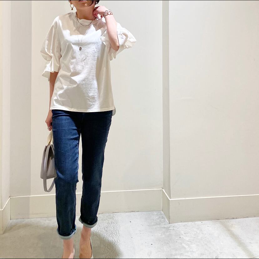 ボトムにはデニムでぐっとカジュアルに♪スニーカー合わせにも◎なおすすめカットソートップスです。