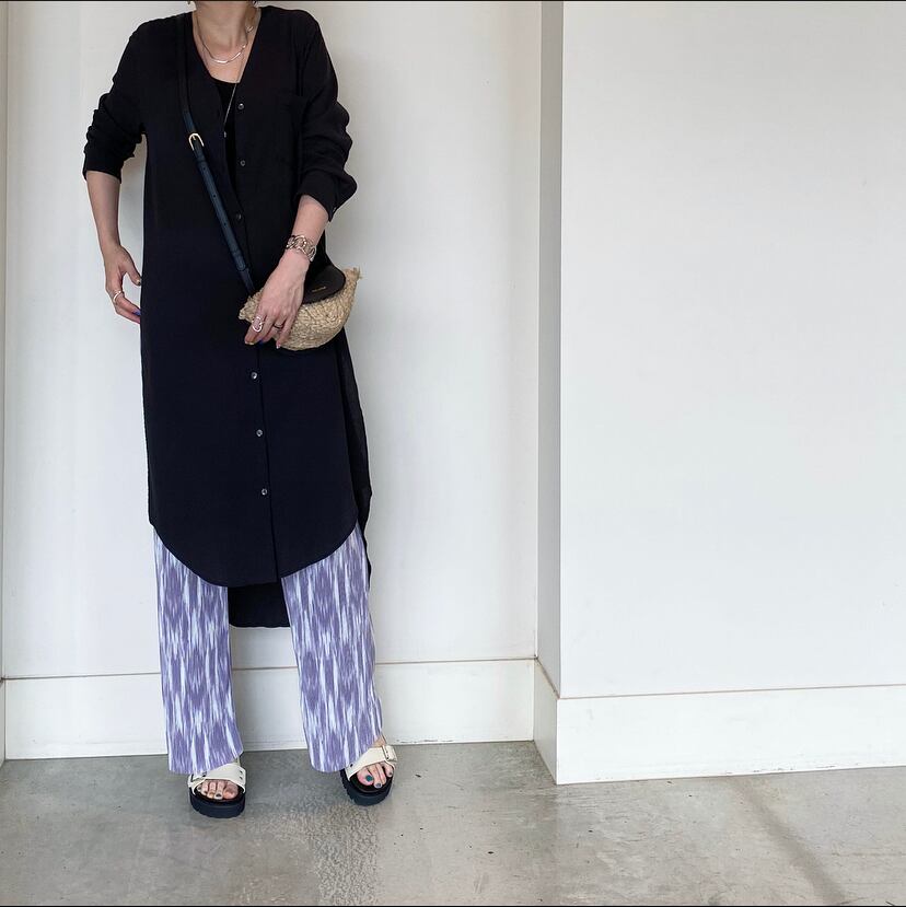 人気のサイドスリットシャツワンピと合せて、裾からパンツがのぞく抜け感あるコーディネートも◎