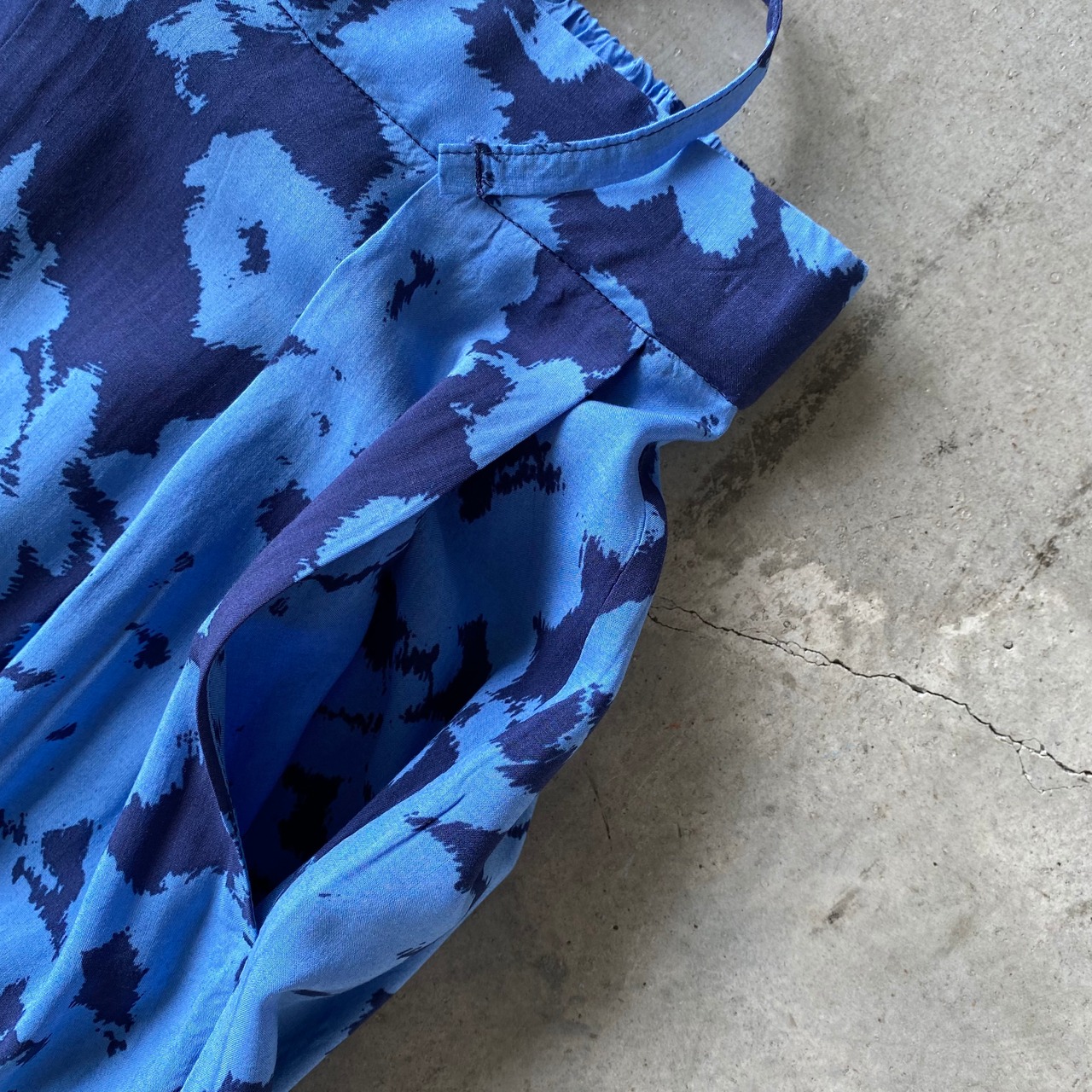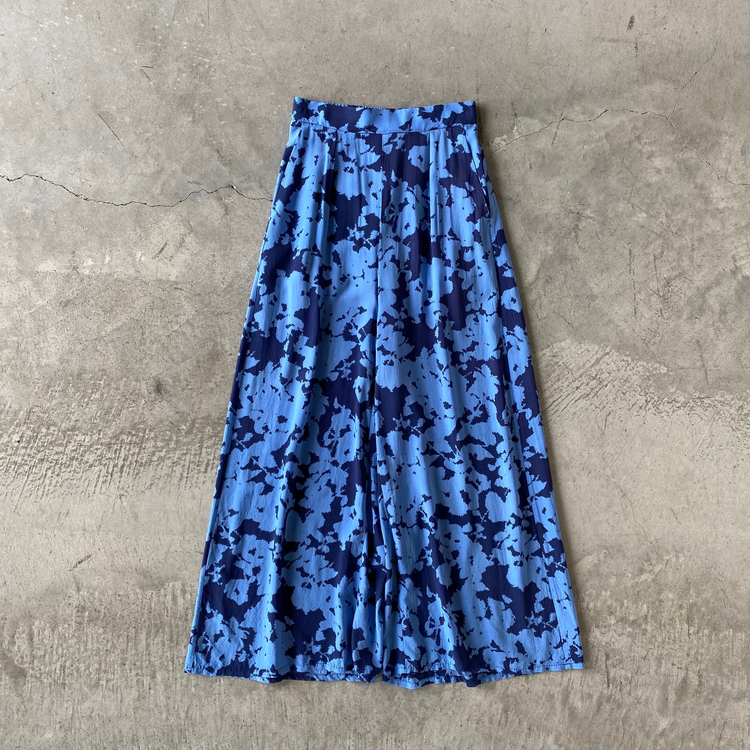 〈GALERIE VIE〉夏の定番のウォッシャブルレーヨン素材に、ブルーの抽象的な柄をプリントしたワイドパンツ。