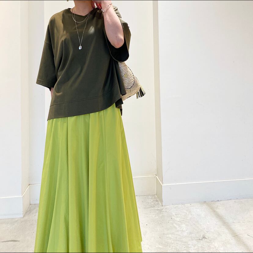 ワイドパンツやスカートにはタックインで◎、テーパードパンツや細身パンツにはそのままゆるっとしたサイジングで◎♪