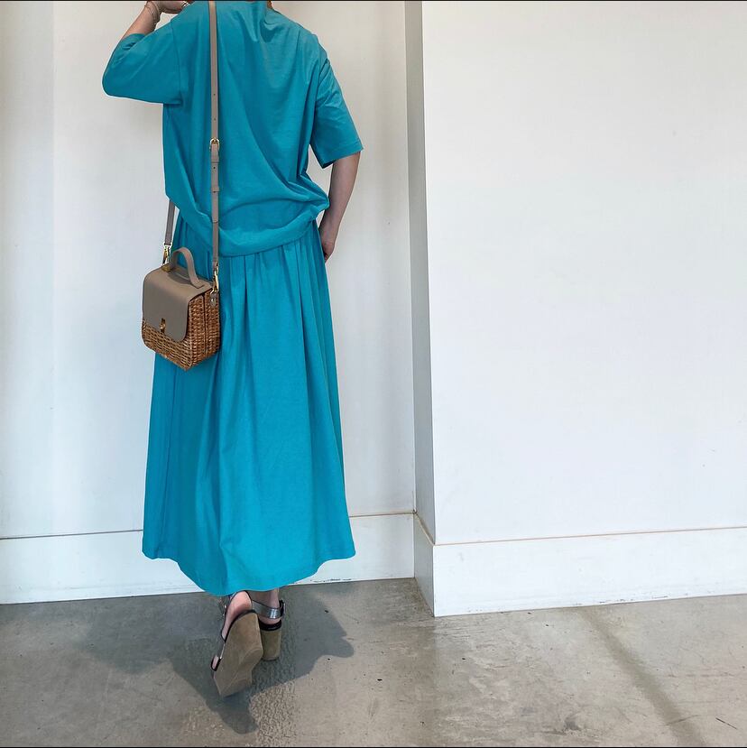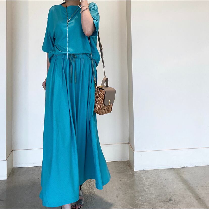 ブルーグリーンカラーは、同素材のカットソートップスと合わせてワンピース見えするコーディネートもおすすめです。