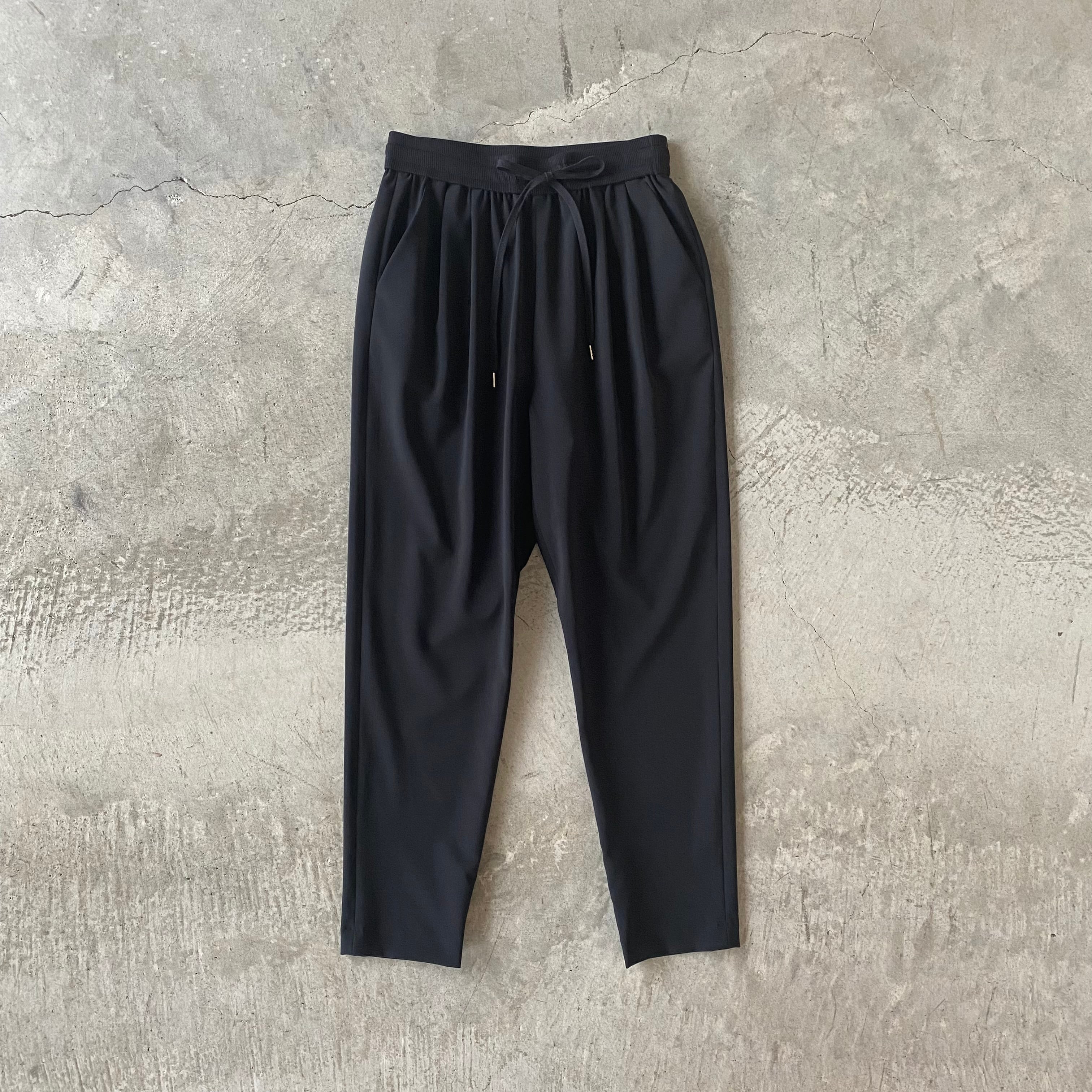 スタイリッシュな素材感とシルエットでありながら、ウエストゴムでストレスフリー。