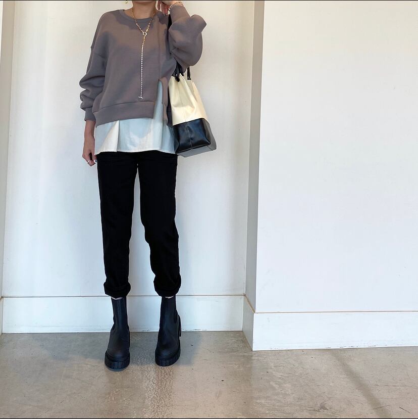 ダンボールニットトップスはショート丈なので、スカートやワイドパンツなどに合わせるとすっきりとした着こなしも叶います。