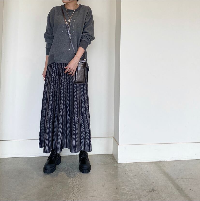 あえてワンピースやフレアスカートなどフェミニンなスタイルに合わせたり、ジョグパンツを裾インさせたり、コレ一つでトレンドライクな着こなしが完成する、オススメブーツです。
