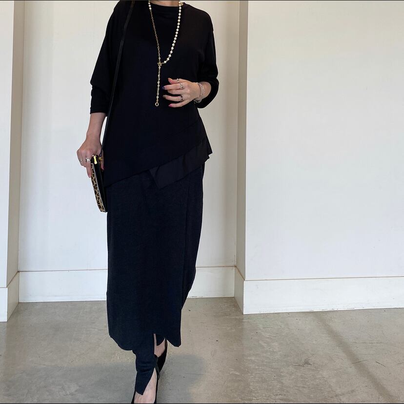 肌触りの良い柔らかなカットソー素材と、光沢のある素材を重ね着したかのようなこれ一枚で着映えのするレイヤード風トップス。