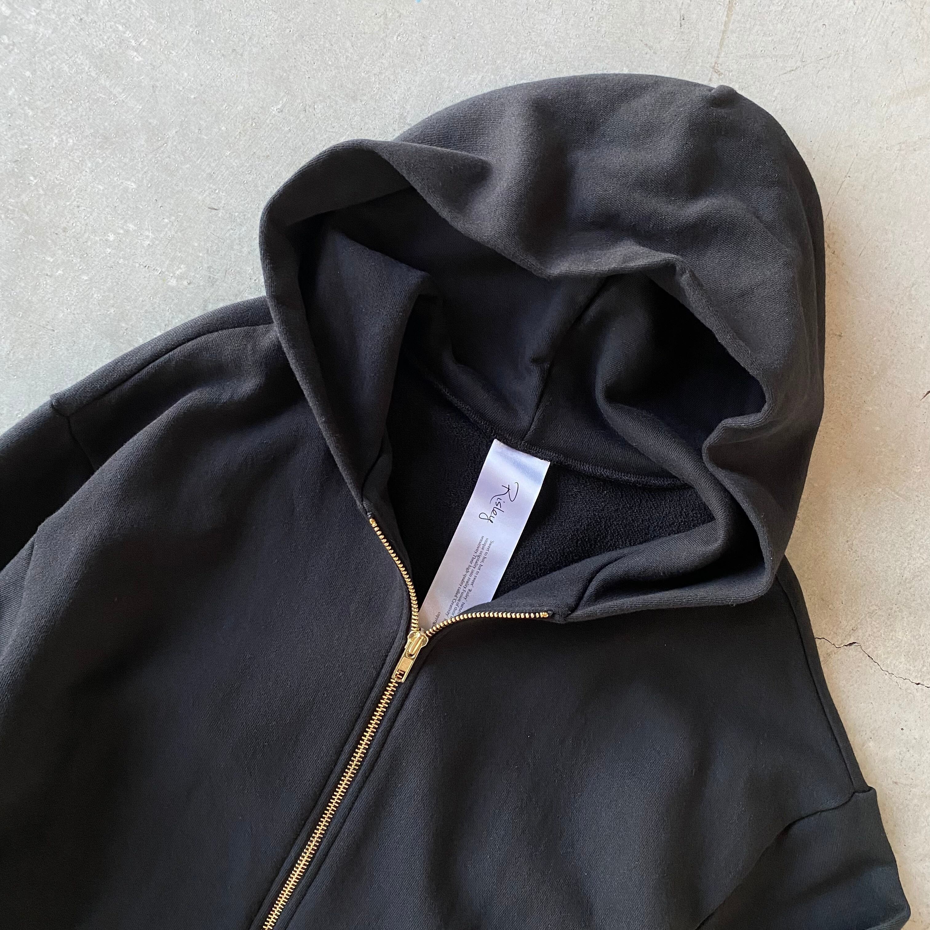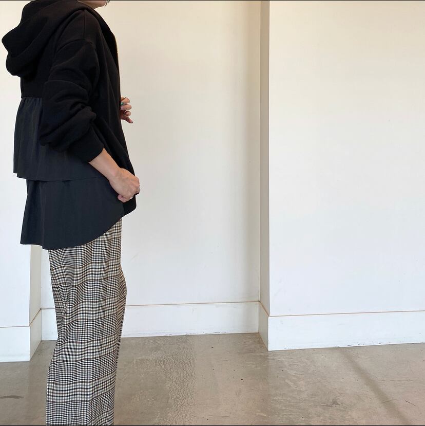 スポーティーになりがちなパーカーアイテムを、スウェット素材と甘すぎないバックフリルデザインで大人カジュアルな1枚に。