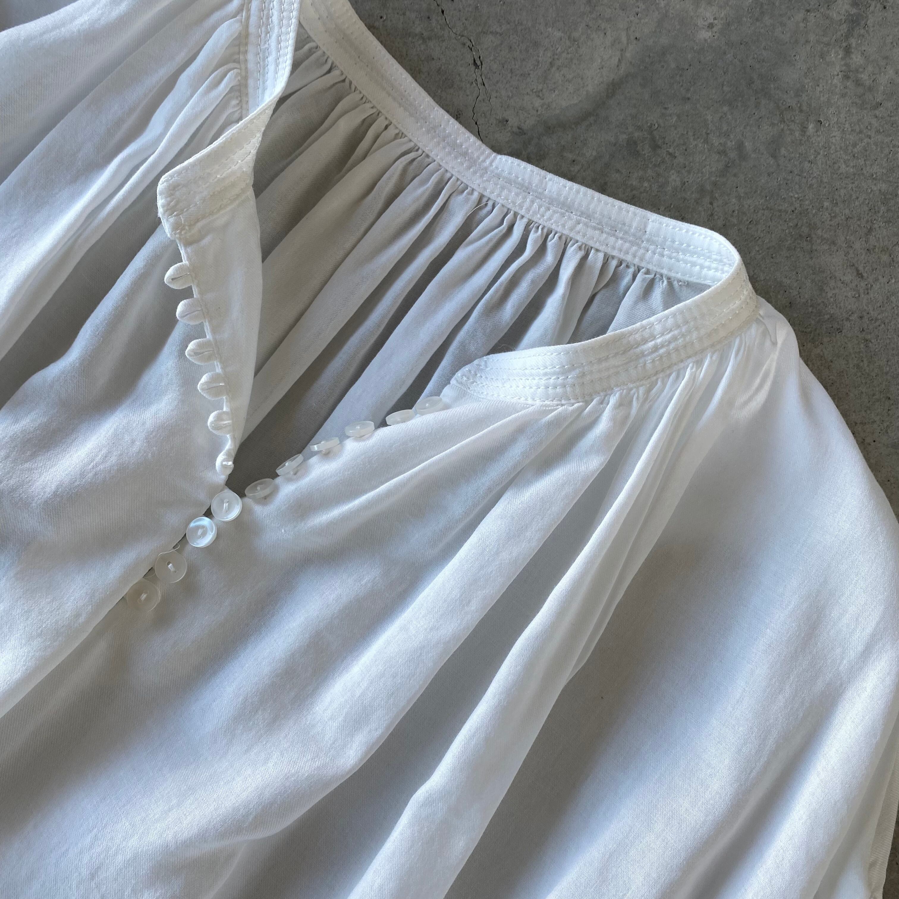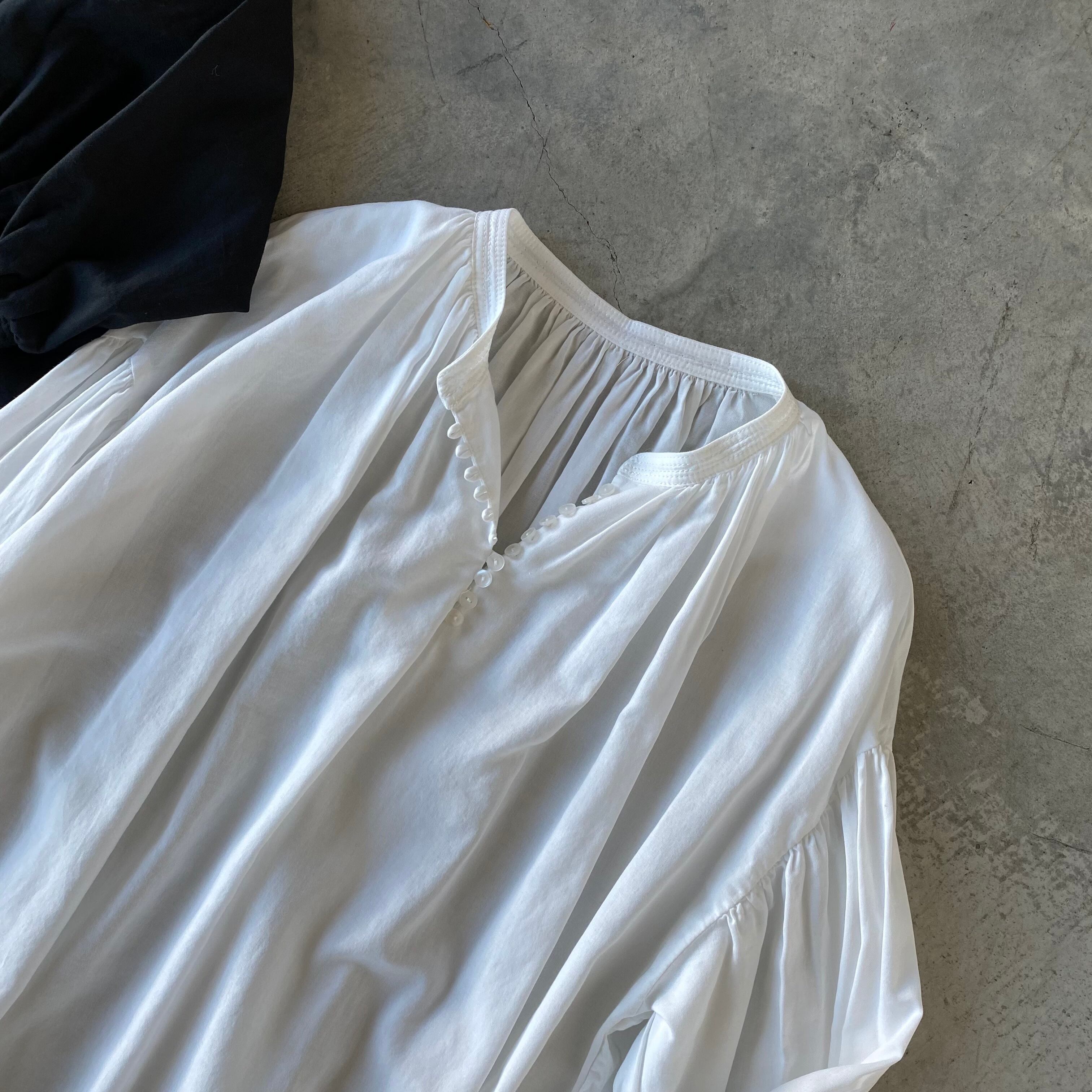 ネックライン、袖口、袖先、バックにたっぷりとギャザーを施した丸みのあるフォルムが女性らしい印象◎。