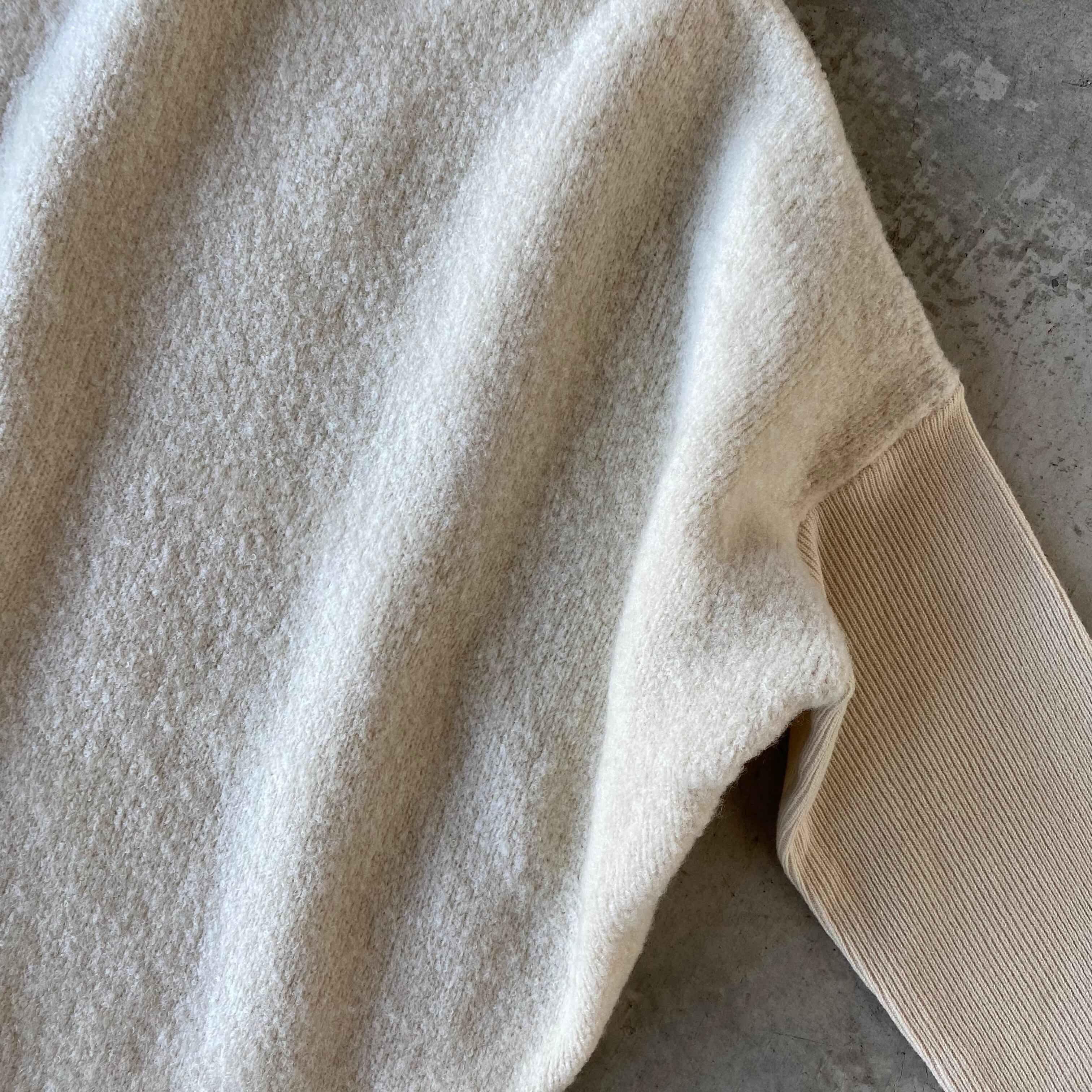 身頃は柔らかく膨らみのあるブークレーヤーンを使用し、袖は別糸でしっかりとしたリブ編みにすることでスッキリとさせた表情感のあるプルオーバー。