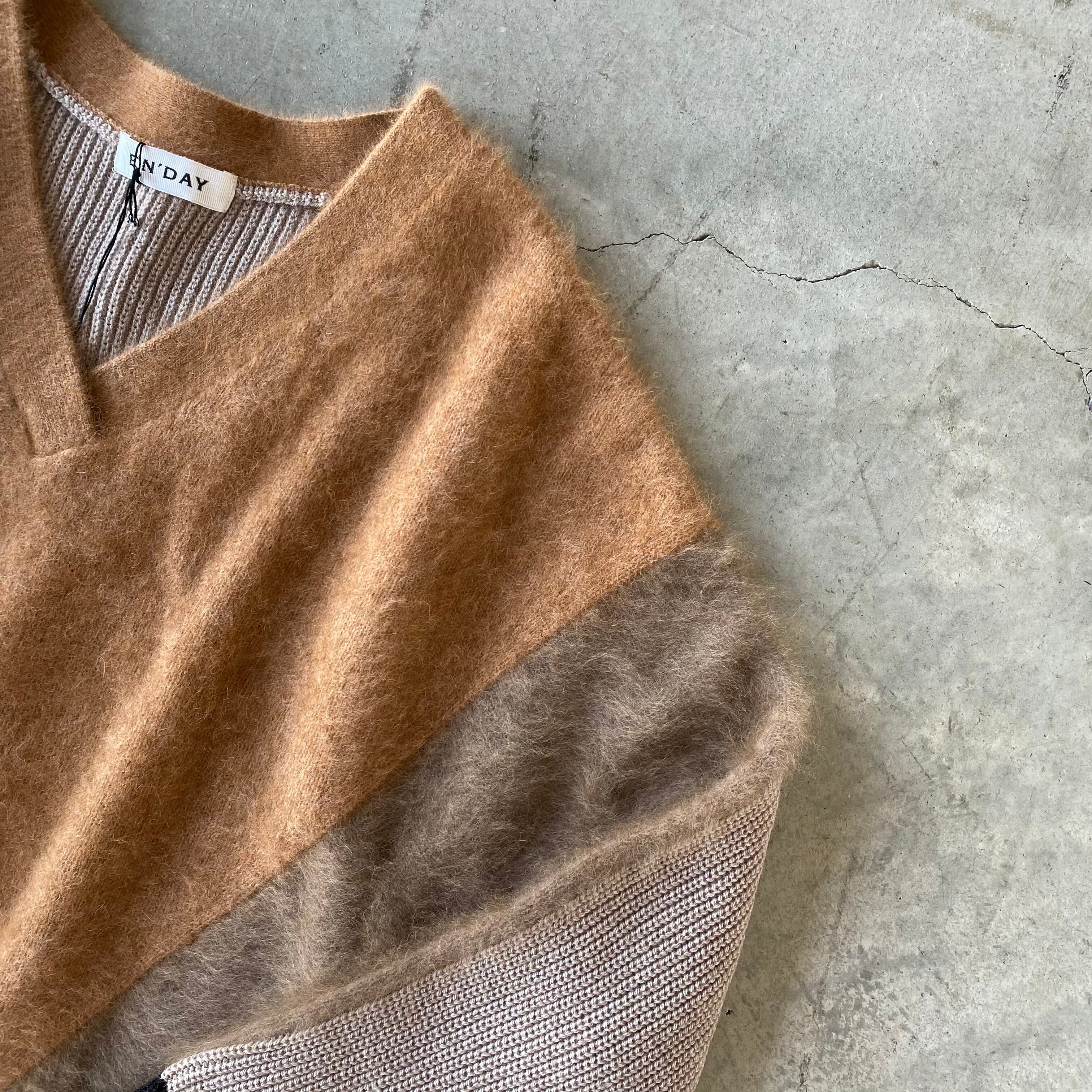 EN'DAY エンデイ ふんわりと包み込むようなシルエット、センスあふれる配色もポイント♪ ラクーンニットコンビバイカラーVネックニット/キャメル×モカ