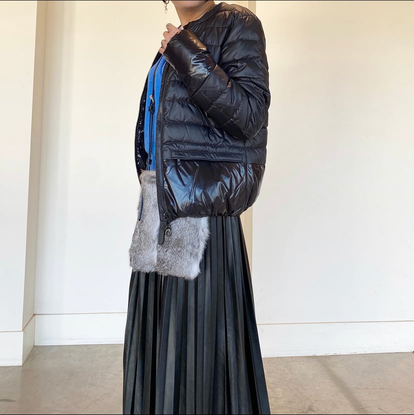 裾部分には美しい艶感の放つシャイニーナイロンを使用しているので、キレイめ感とモード感をプラスしています。
