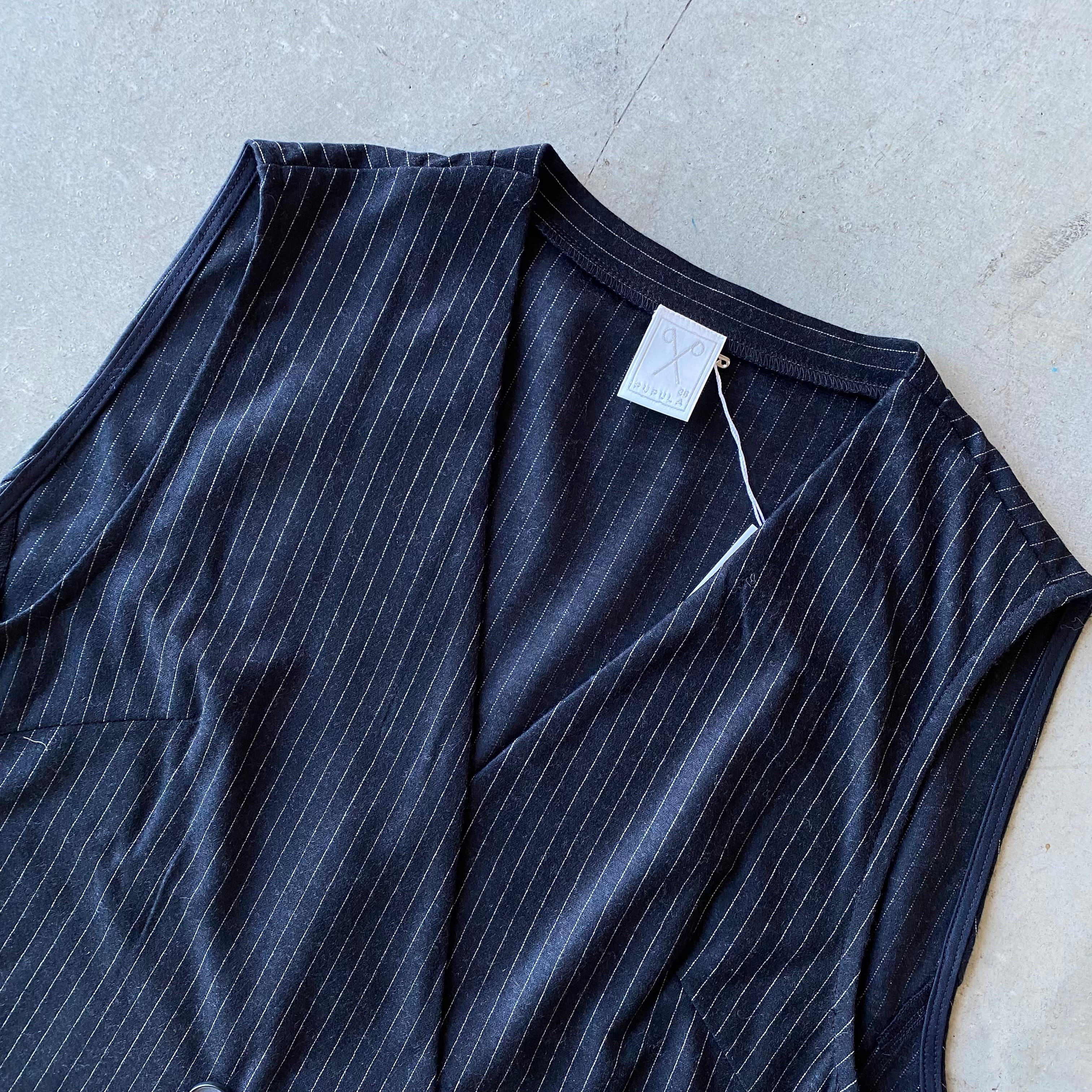 ストライプ柄で自然と"Iライン"に◎♪縦長効果でスタイルアップ♪ ダブルボタン ウール×シルク 上質カットソーストライプロングジレ/ベストです。