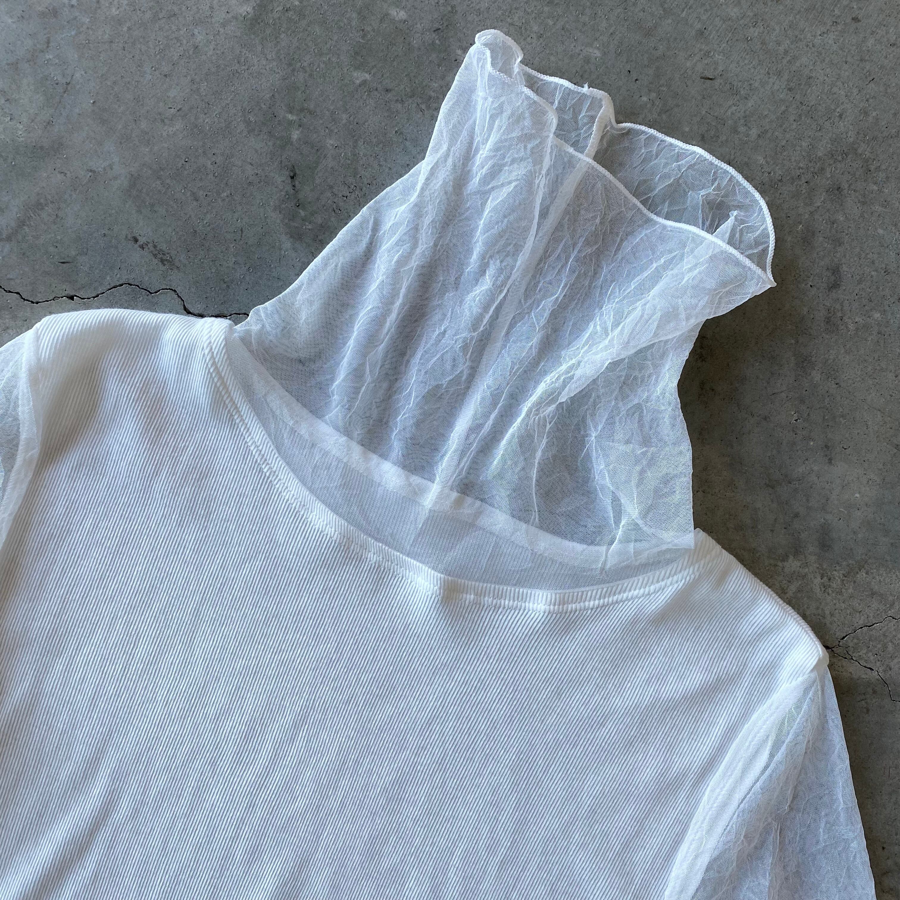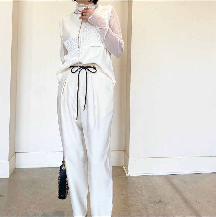 ハイネックの首元とお袖の透け素材がポイント◎大人な印象を与えてくれます。