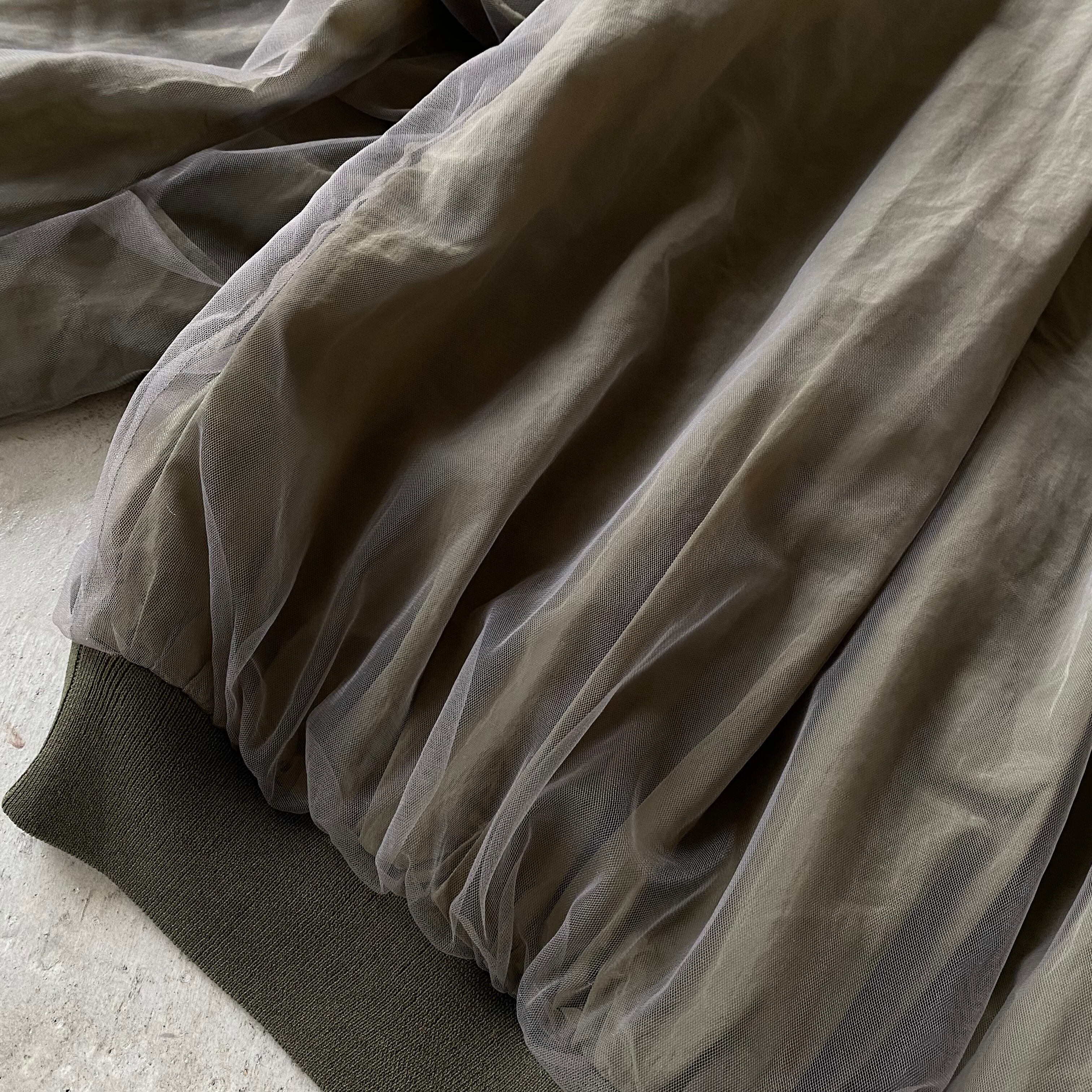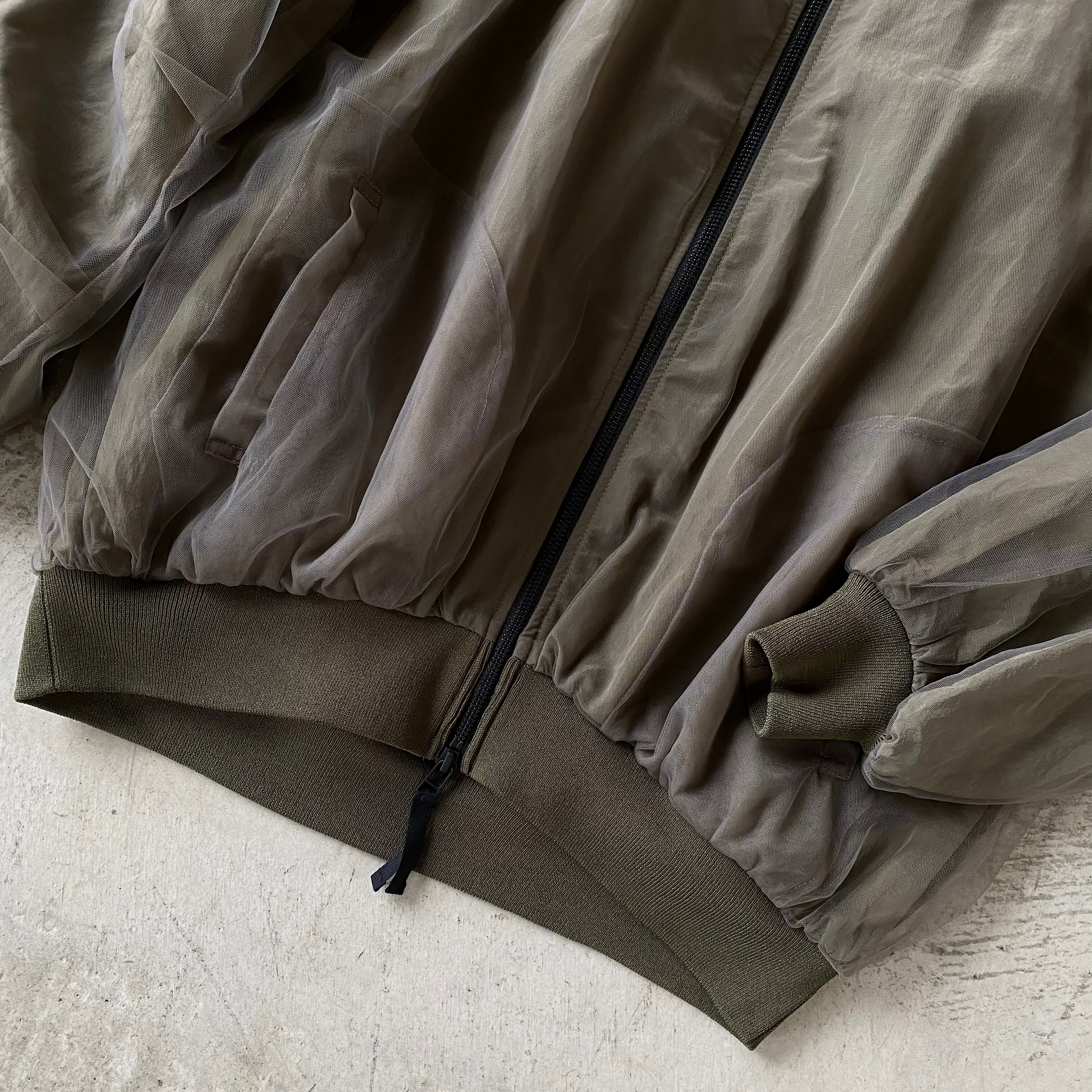 透け感のあるシアー素材とタフタ素材をレイヤードした、トレンド感溢れるノーカラーブルゾン。