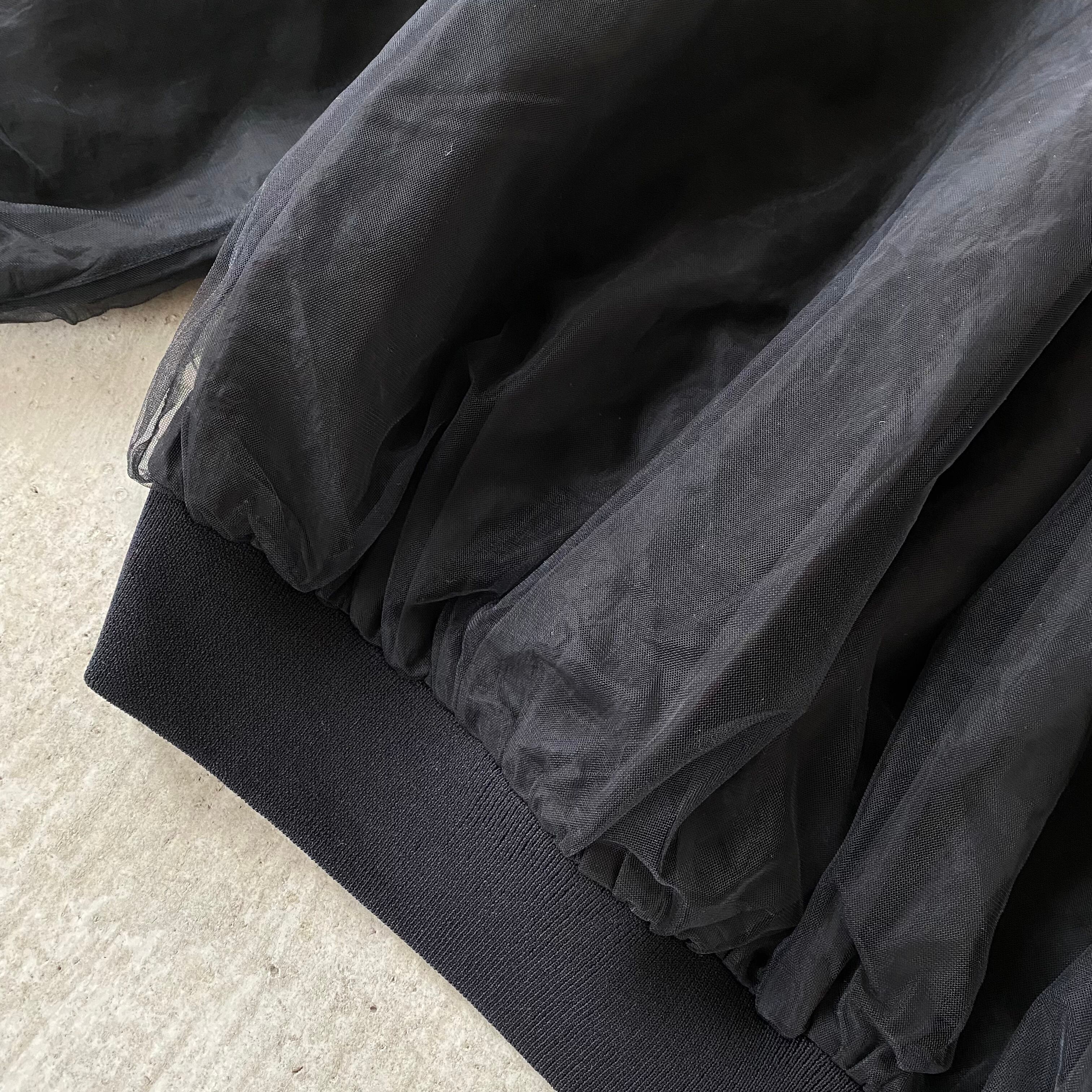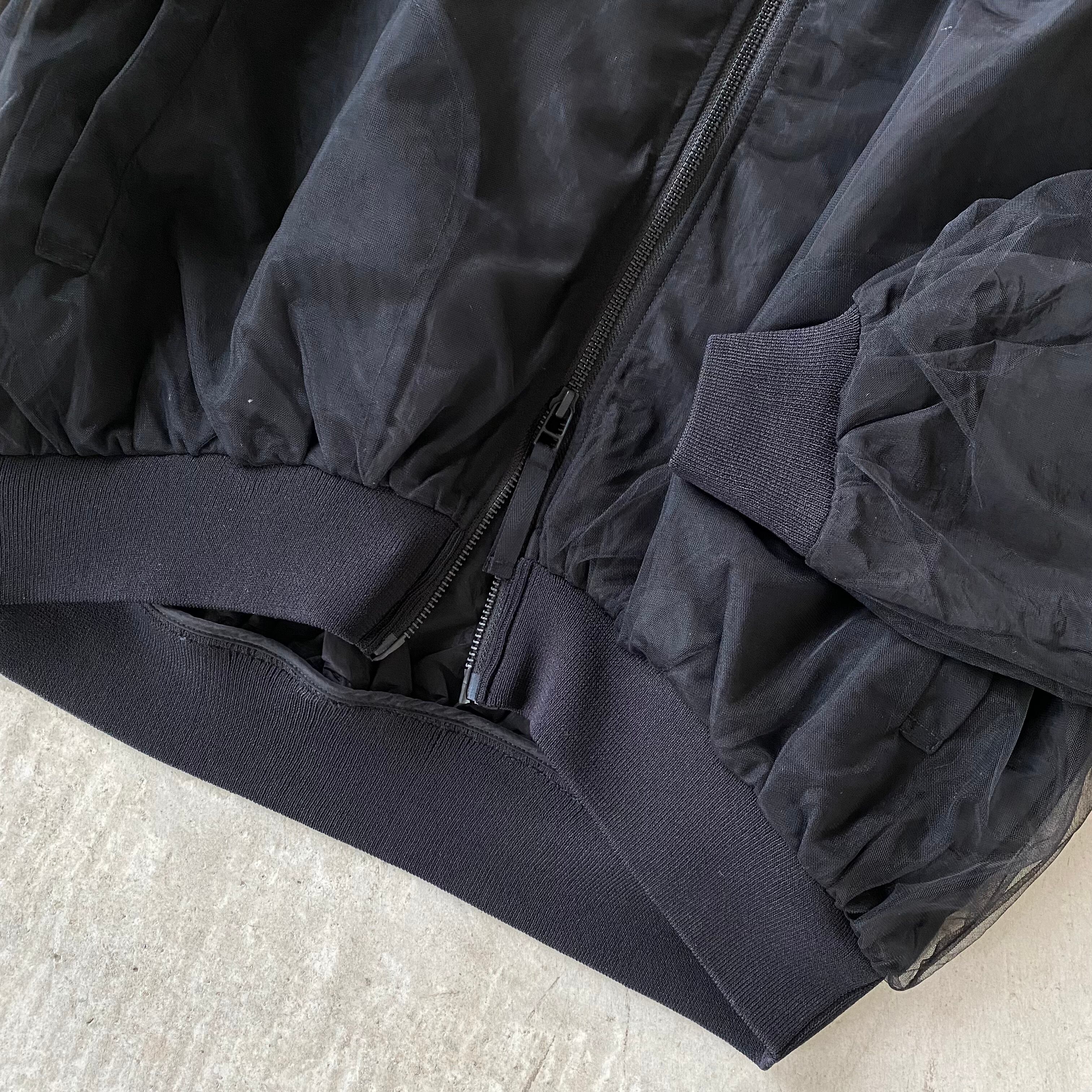 透け感のあるシアー素材とタフタ素材をレイヤードした、トレンド感溢れるノーカラーブルゾン。