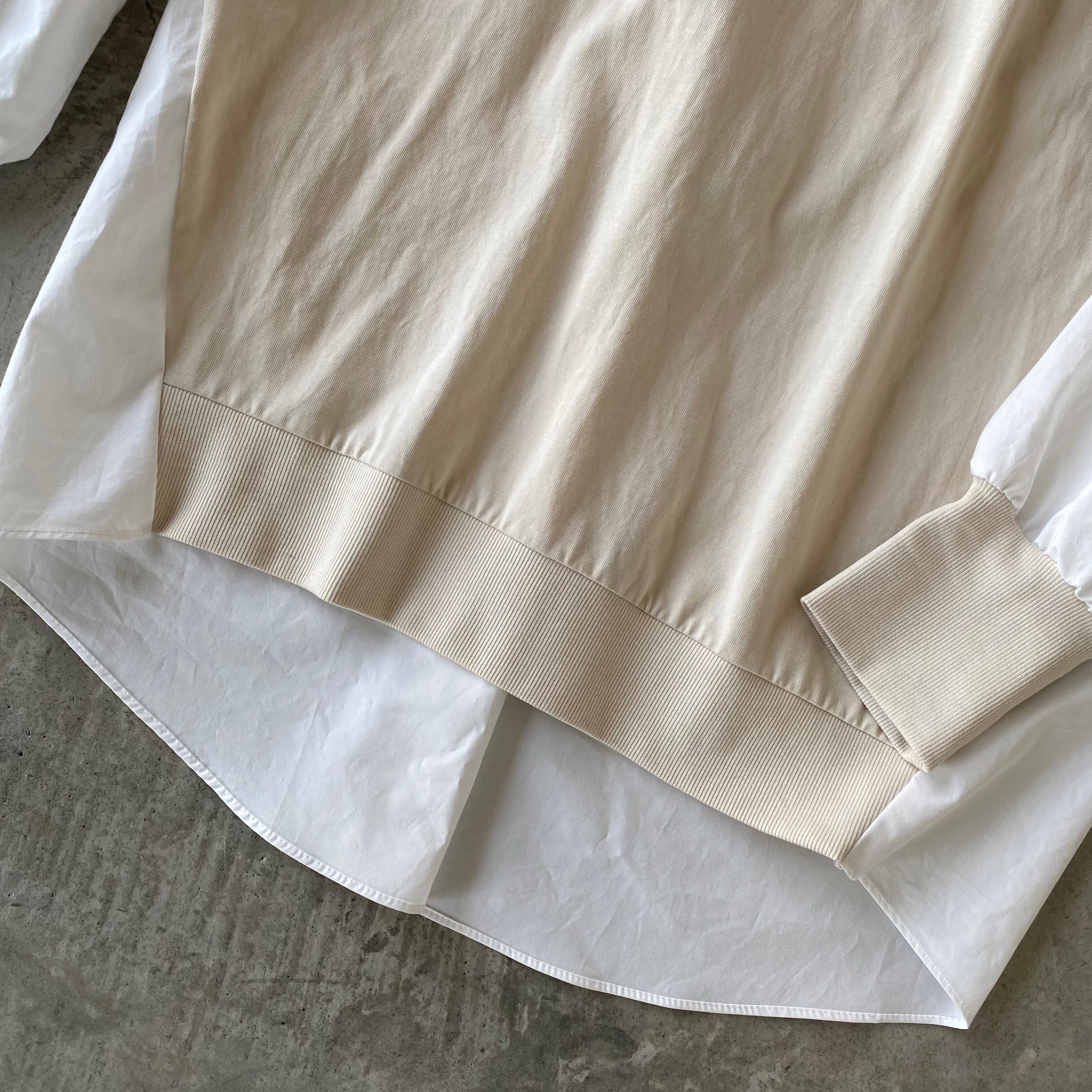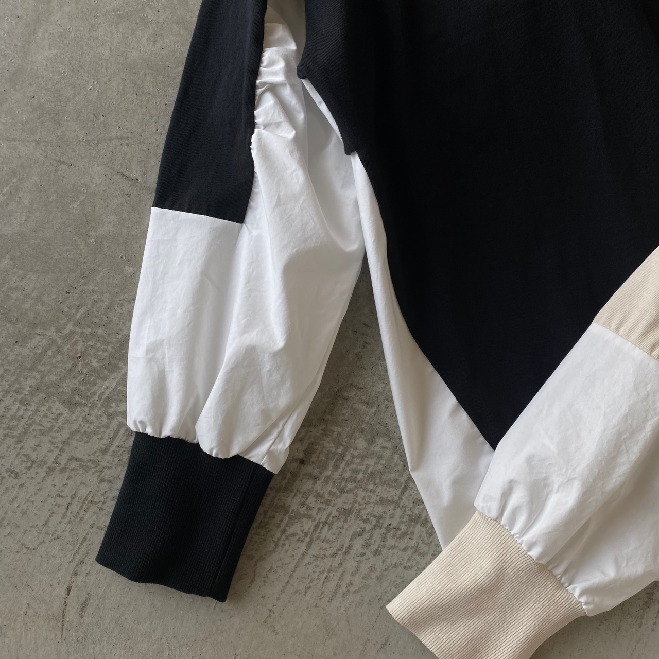 1枚でしっかり存在感あり♪異素材コンビで洒落感も◎♪ カット素材&布帛ドッキングプルオーバートップスです。