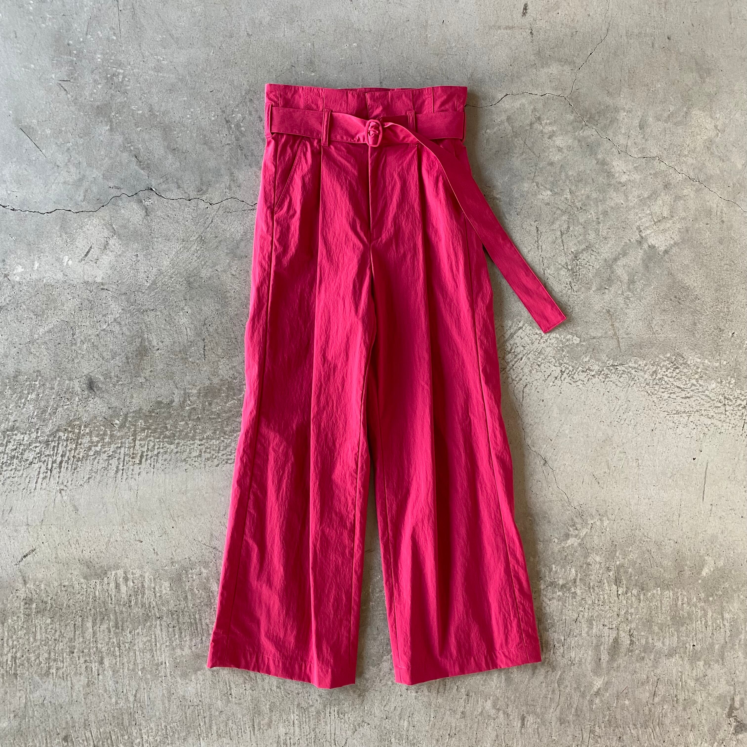 リサイクルナイロン素材のソフトでしなやかな風合いが特徴のベルトディティールのワイドパンツ。