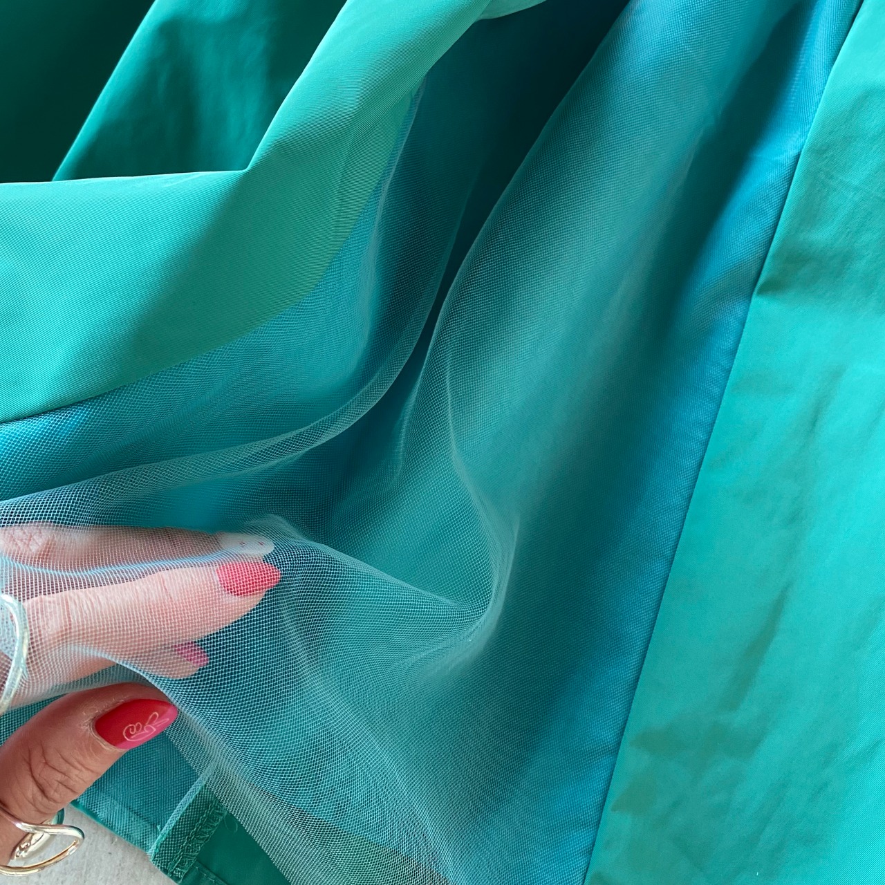 トレンド "グリーンカラー"が春夏コーデに映える♪ ウエストリブ タフタ×チュールロングスカートです。