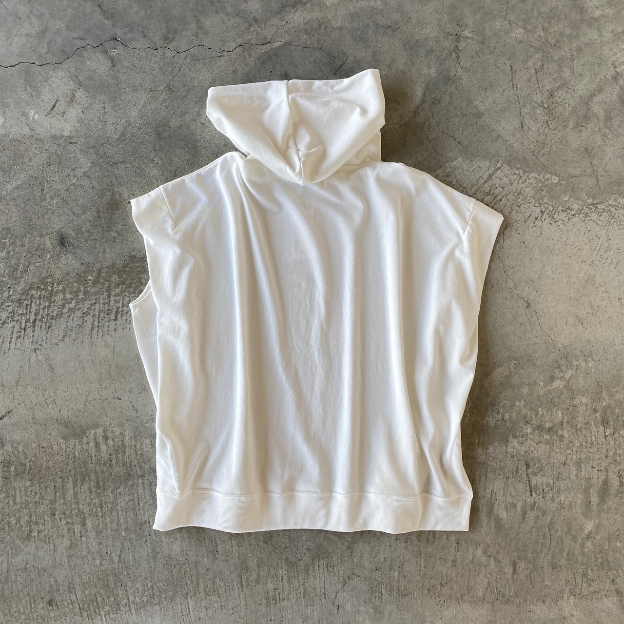 ルーズな着こなしに◎!デイリーユースにぴったりなオトナなフーディトップス♪ ハイツイストジャージースリーブレスフーディー です。