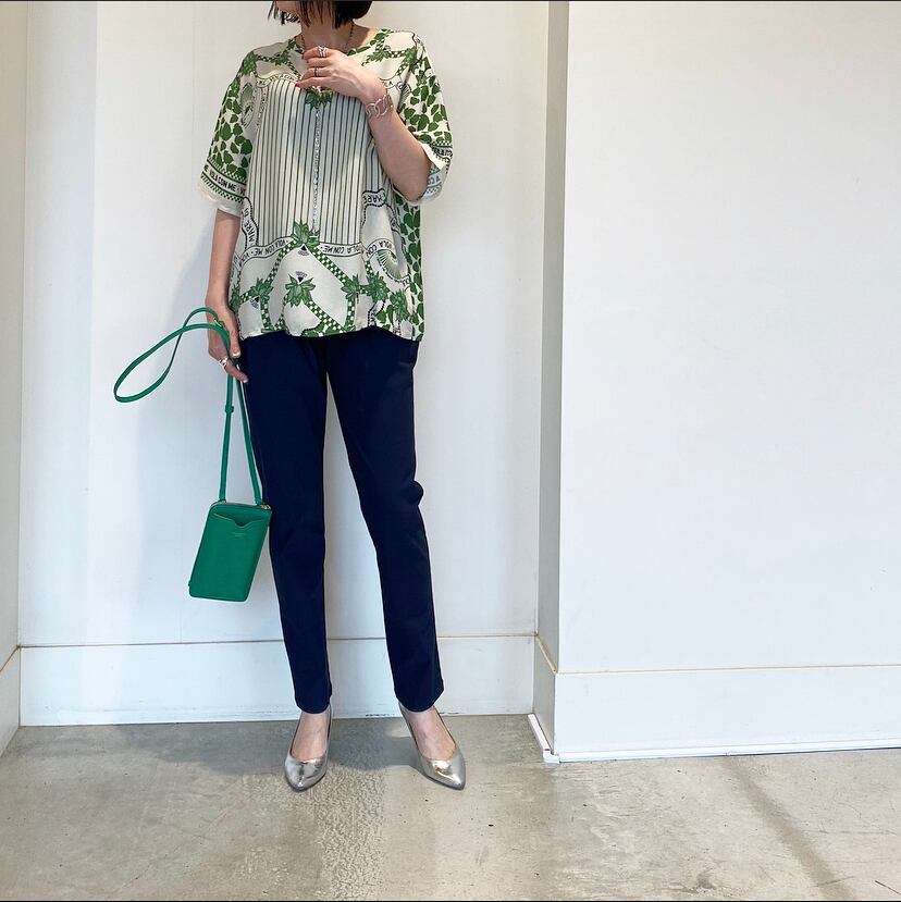 キレイめ感のあるさらっと落ちる素材感なので、フロントインでスカートやワイドパンツなどのボリュームボトムスとも好相性◎♪