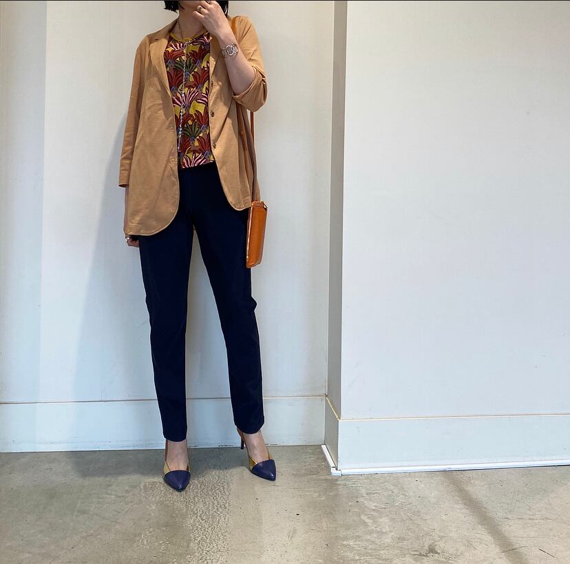 インナーにはプリントブラウスをレイヤードしたり、ロゴTなどとのコーデもオススメですよ♪