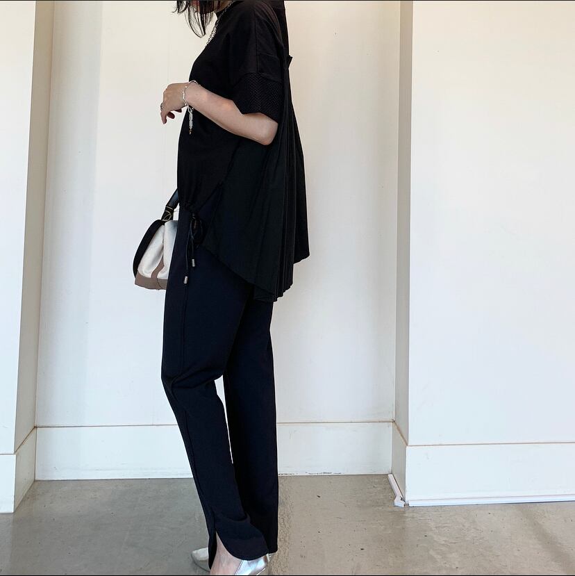 フロント部分はコットン素材のカットソーでとっても着やすく、バック部分は布帛素材で、キレイめ&きちんと見えるのも嬉しいですね。