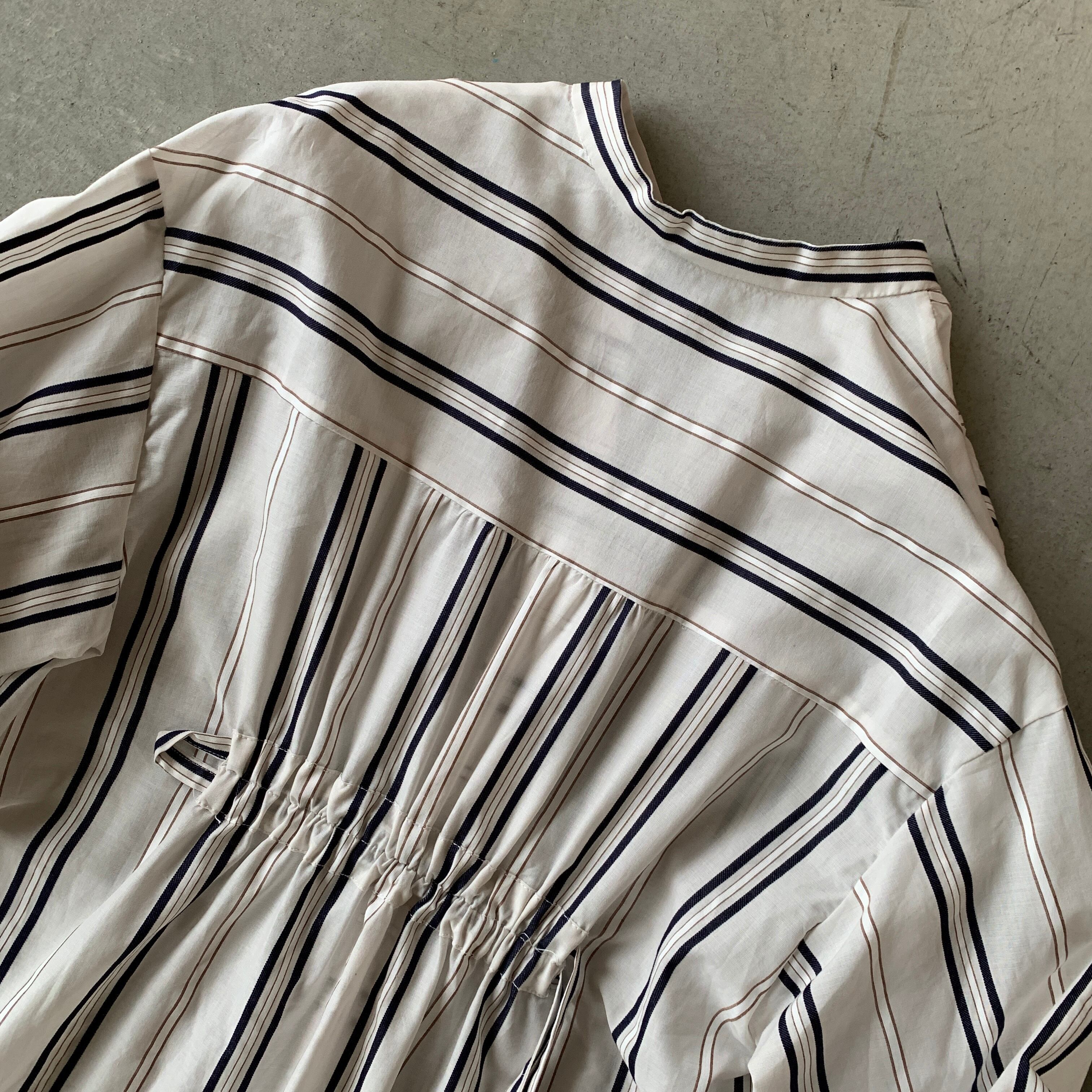 Lallia Mu ラリアムー 長めの着丈で安心感♪バックギャザーデザインでスタイリングも華やかに♪バックギャザーストライプチュニックシャツ