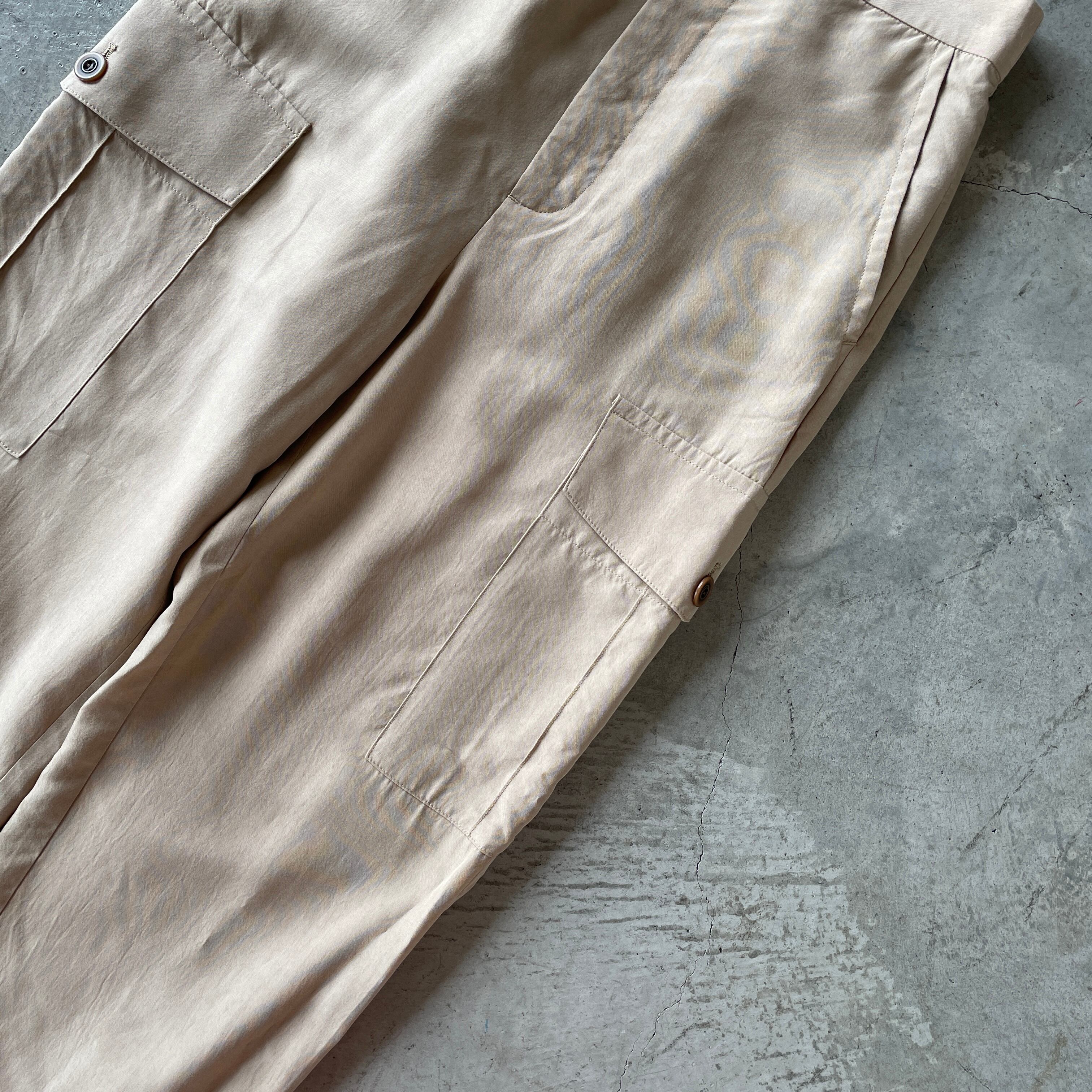 ミリタリーデザインと落ち感と上品な光沢感のある素材の組み合わせが魅力な、ミリタリーパンツ。