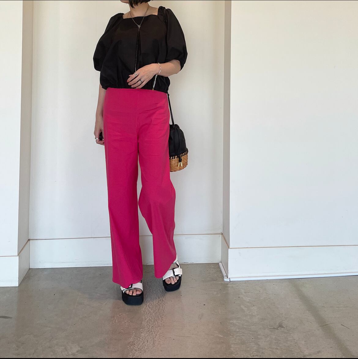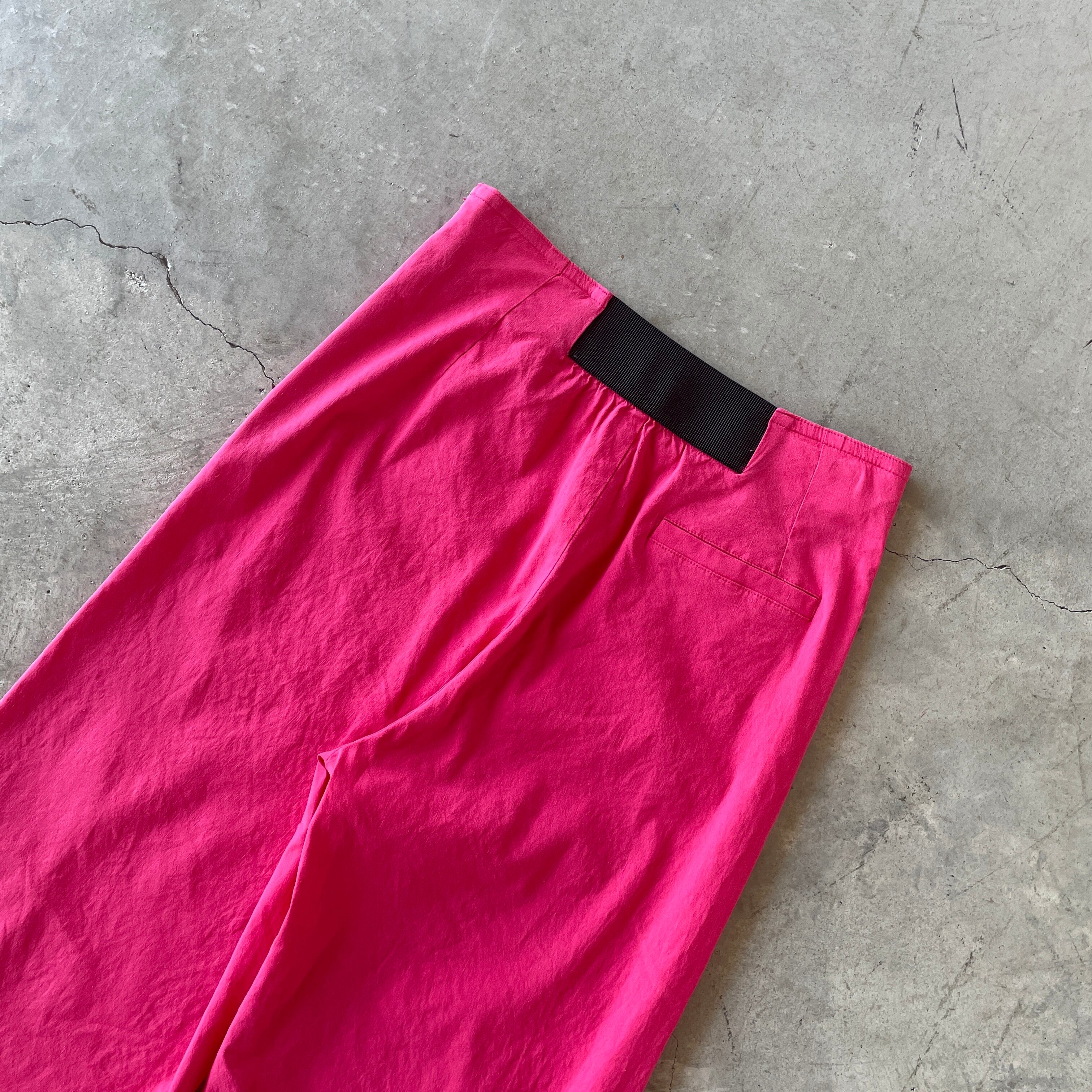 ひときわ目を惹く!ピンクカラーのセミワイドパンツ。