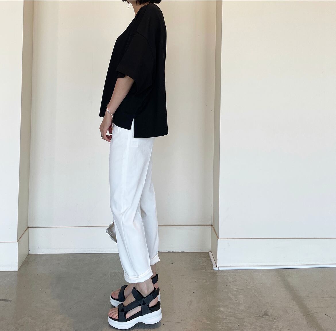 ワイドパンツやスカートにはタックインで◎、テーパードパンツや細身パンツにはそのままゆるっとしたサイジングで◎♪
