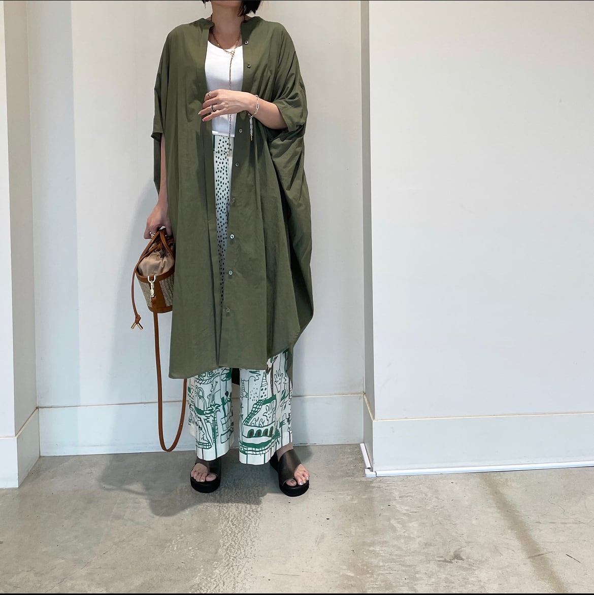 夏の羽織アイテムとしても◎、上品なカーキカラーで秋口までロングシーズン楽しめるオススメの一着です。