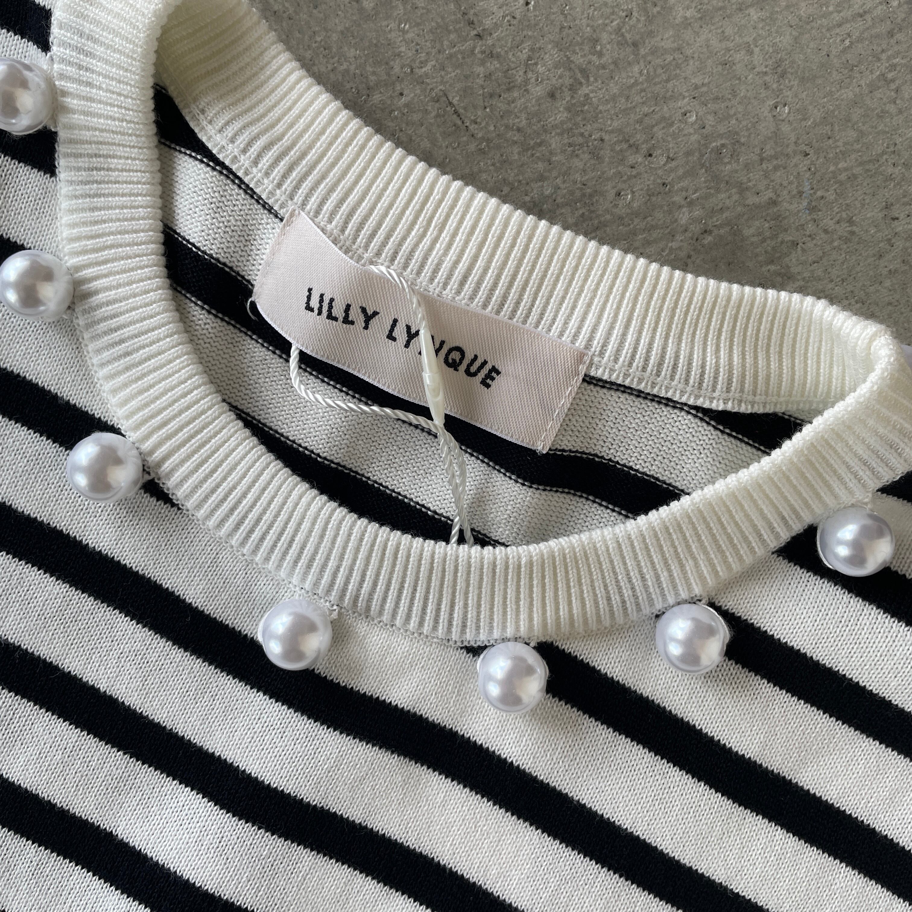 LILY LYNQUE リリーリーン 華やかパールボタンでキレイめカジュアルコーデに♪ パールボタンコットンニットプルオーバー