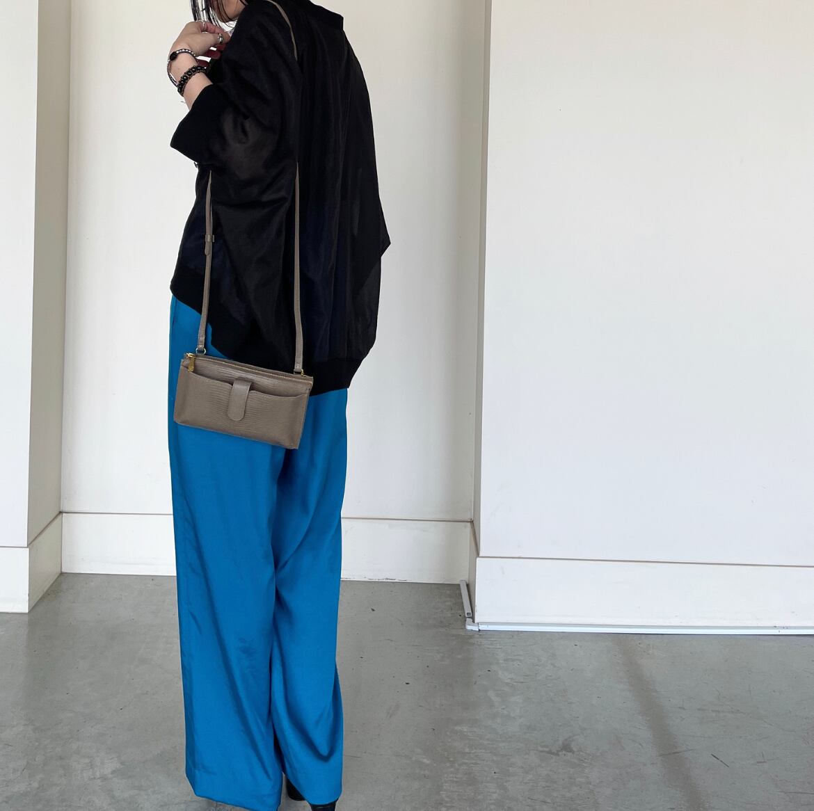 トップス次第で色々な着こなしの楽しめる、オススメサテンパンツです。