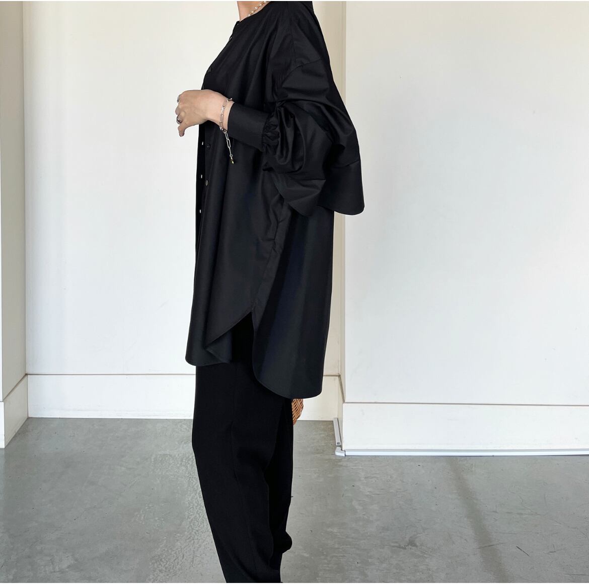 首元がすっきりと見えるバンドカラーデザインで抜け感をプラス♪