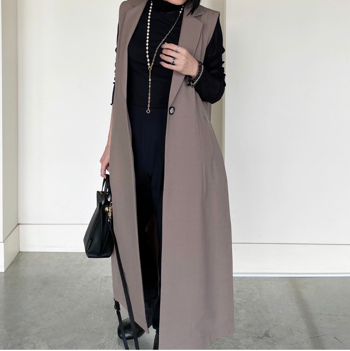 シンプルなコーデにサッと重ねるだけで、大人ムードなコーデに仕上がるロングジレ。