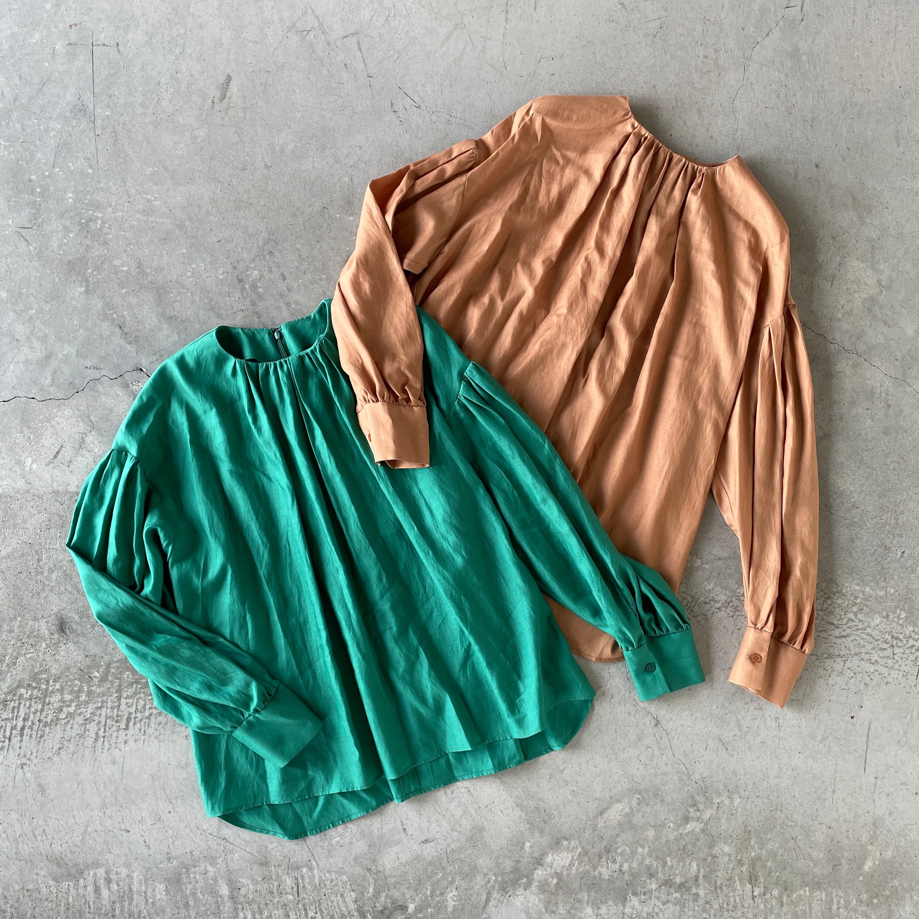落ち感があり、しっとりと滑らかな風合いと自然な光沢感が魅力なギャザーブラウス。