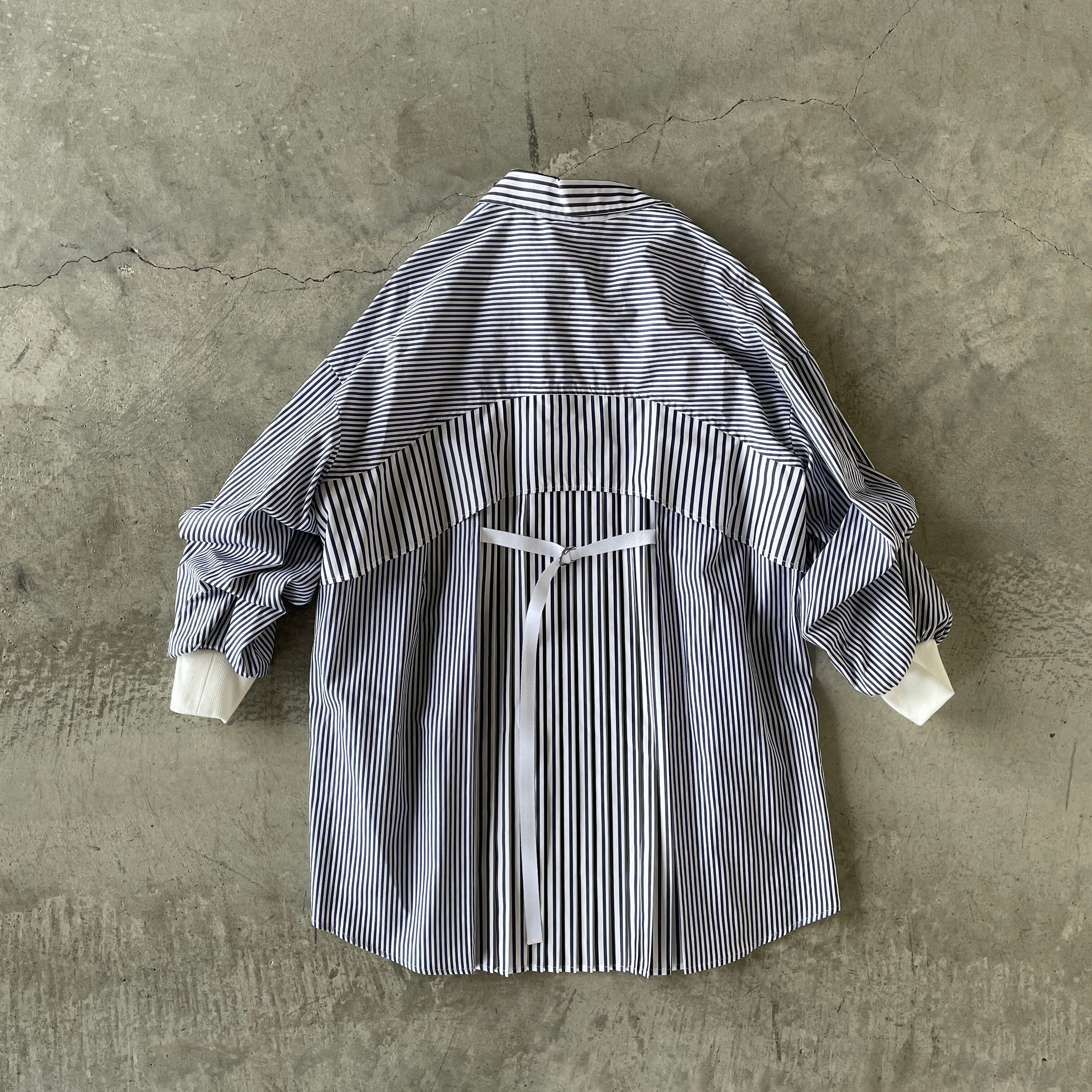 ふわっと華やかなバックプリーツが後ろ姿まで映える♪ バックプリーツストライプフレアシャツ/Lallia Mu ラリアムー