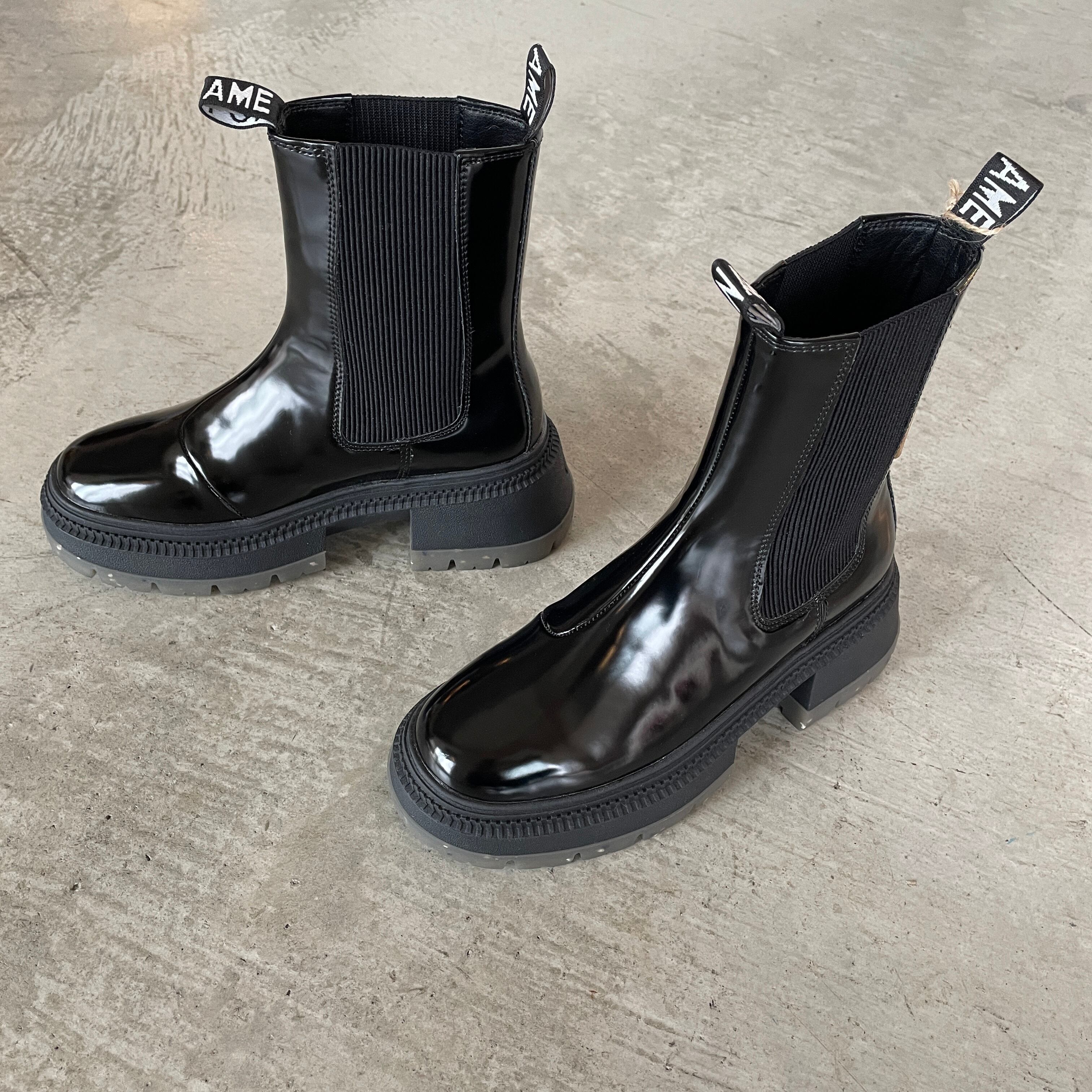 まだまだ注目のボリュームソールが存在感抜群な♪ 厚底サイドゴアエナメルブーツです。
