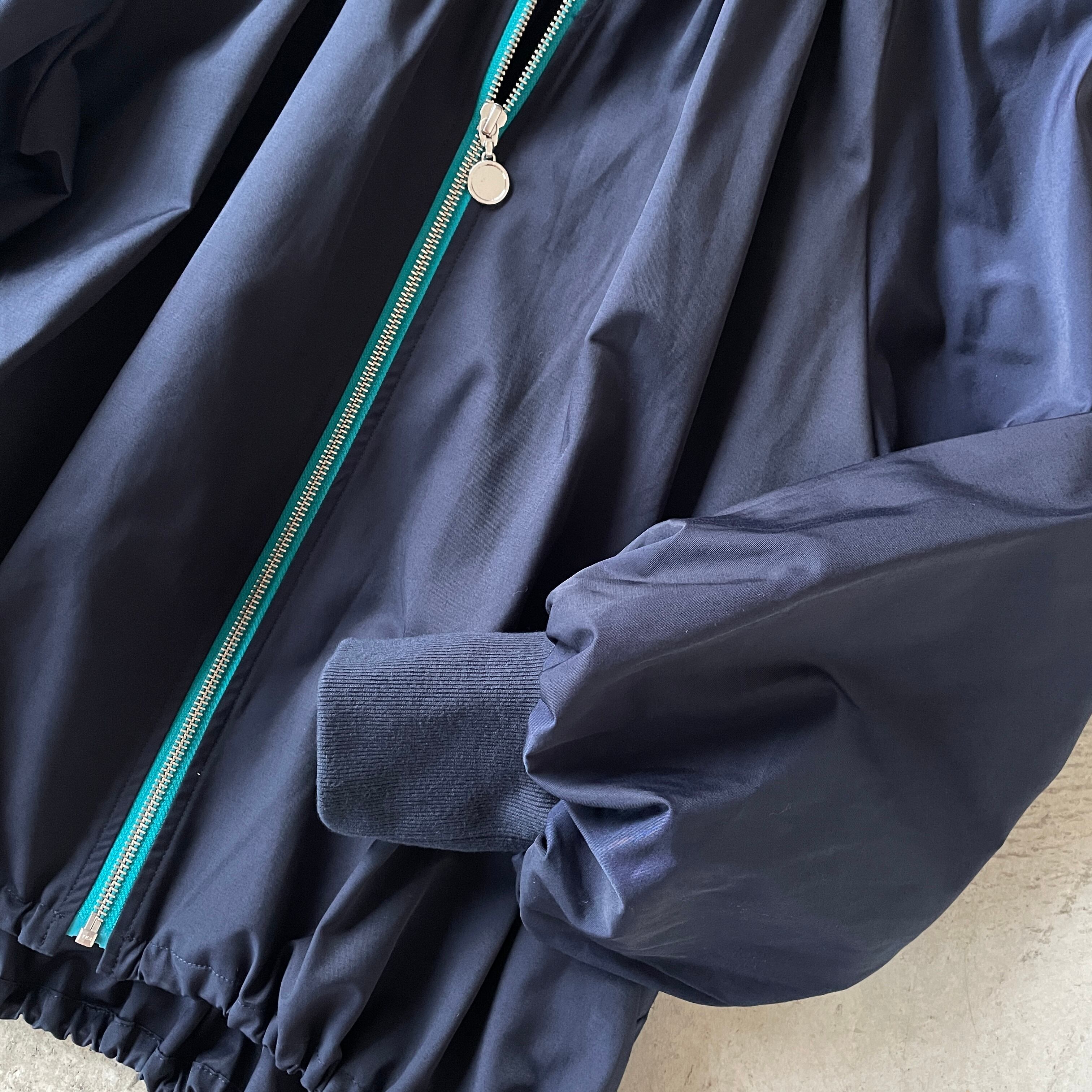 バイカラーフロントジップがアクセントに♪ ギャザー サテンMA-1風ブルゾン/ネイビーです。